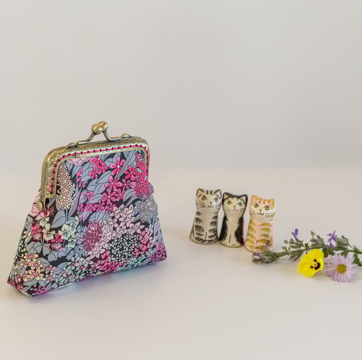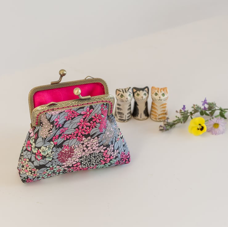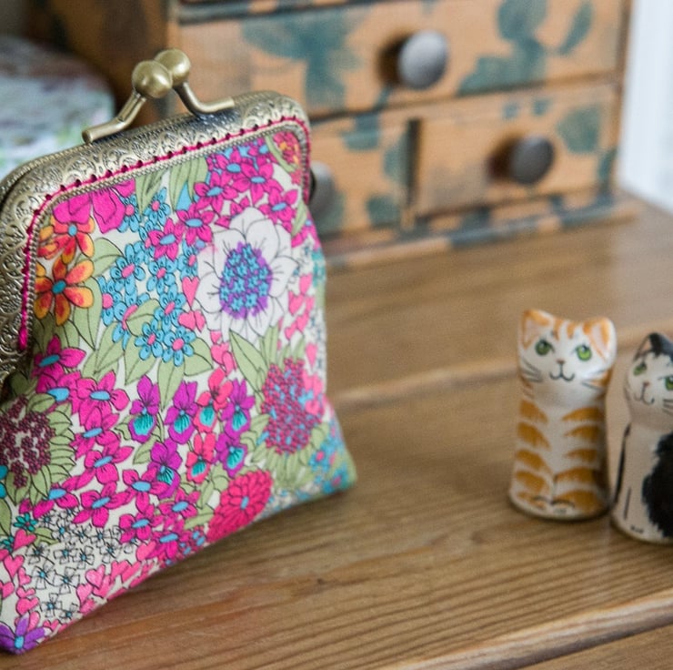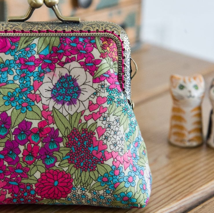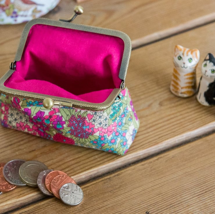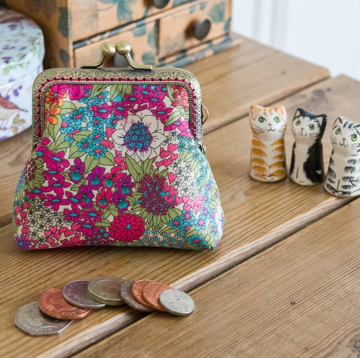 I make purse with a choice of two different colourways of a gorgeous Liberty Tana Lawn print called 'Ciara'. The outer and lining are interfaced with woven cotton and the outer also has some soft fleece to give a puffy effect that feels nice in your hand. The inside of the purse is lined with a bright pink Essex Linen - hard wearing enough to stand up to those coins jiggling about.