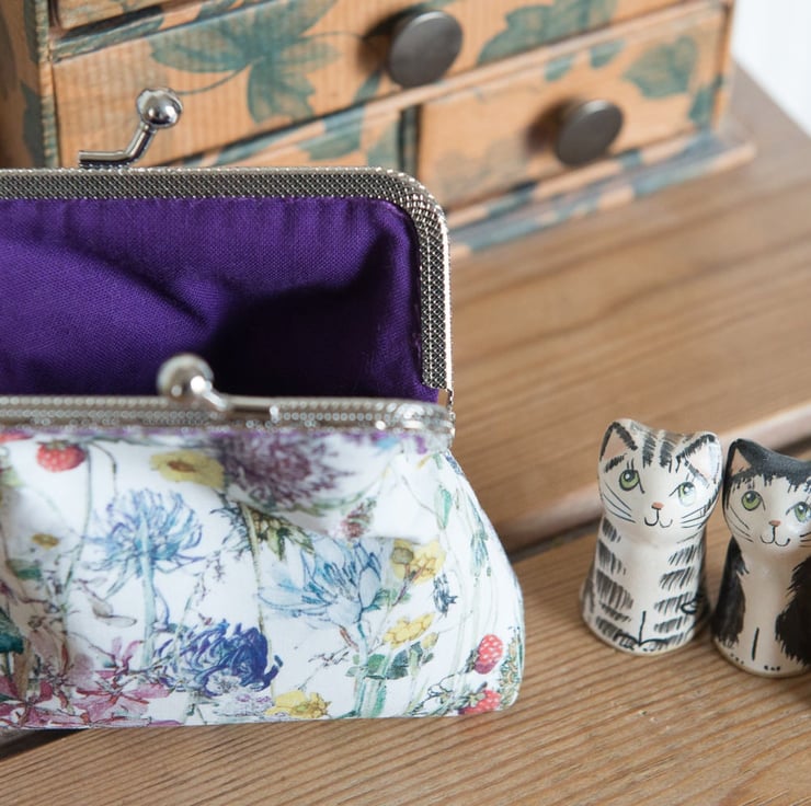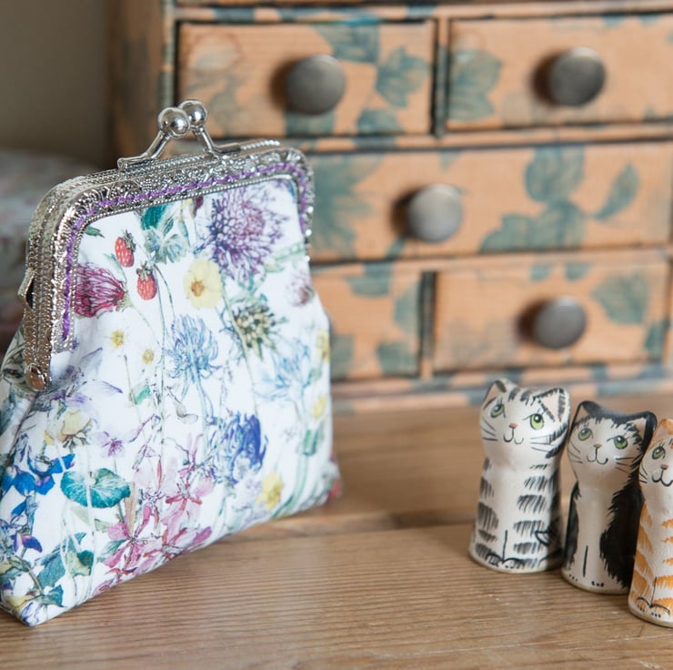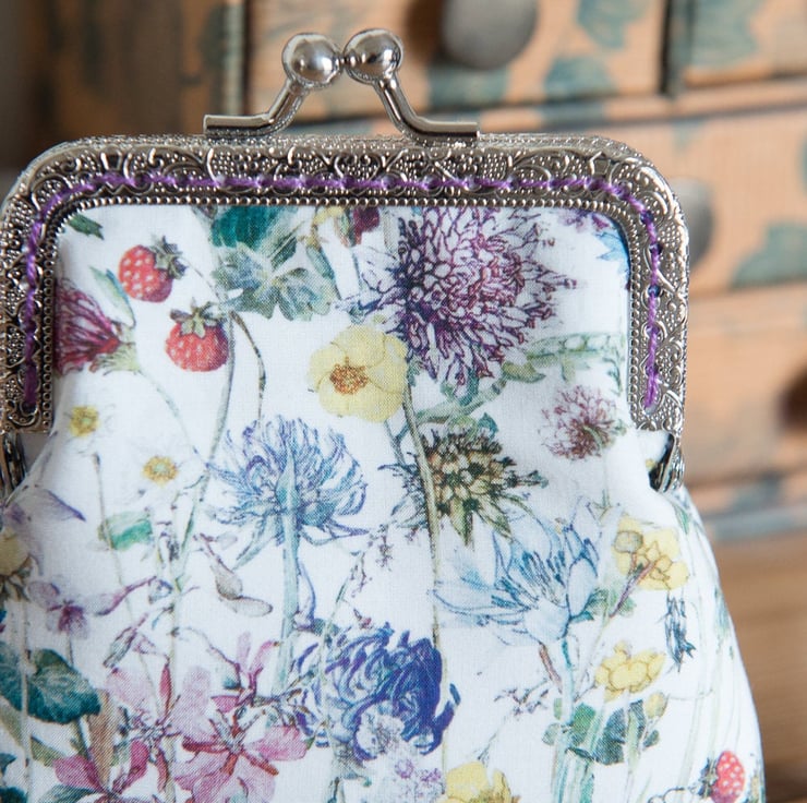 I've made the purse with a beautiful and delicate Tana Lawn print called 'Wild Flowers' by Su Blackwell, which is a recollection of early childhood journeys across the British landscape in discovery of native flora. This joyous Liberty fabric was initially inspired by illustrations from an early 19th Century book, 'Field Guide to Wild Flowers in Britain'. You can find another version of this purse with a dark background in my shop.