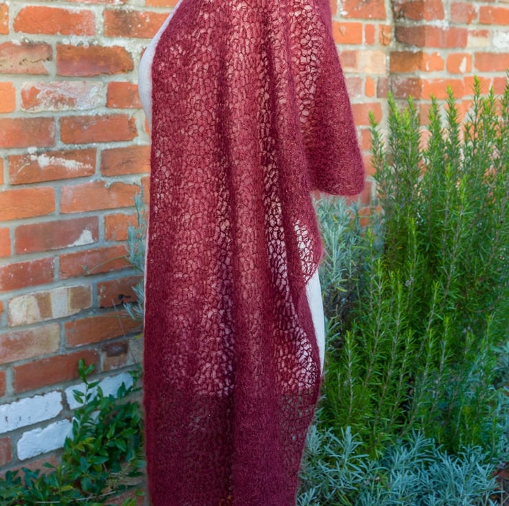 The wrap is a generous size at 200cm (79 inches) long and 45cm (18 inches) wide and is made with a yarn blend of mohair and silk, which, despite the lace crochet design, is very warm.