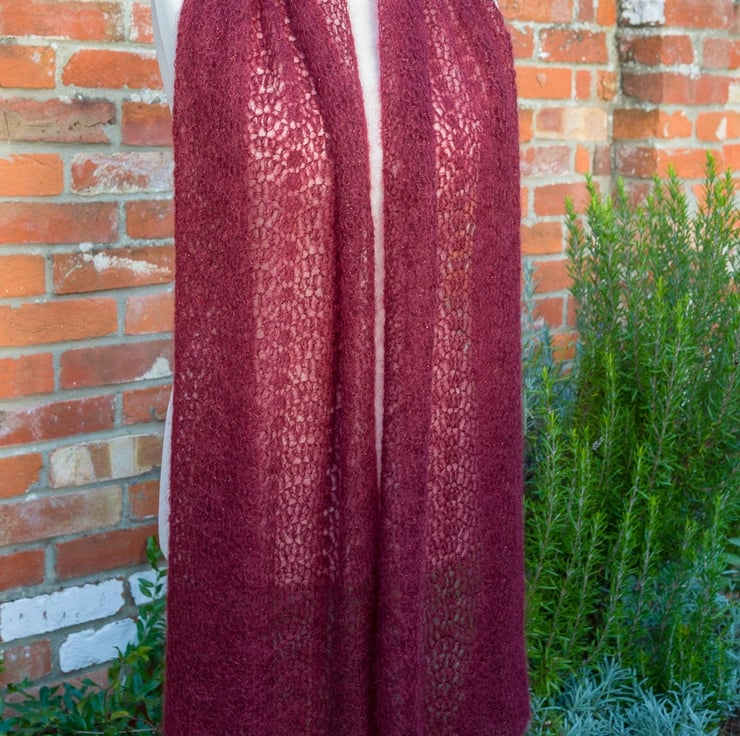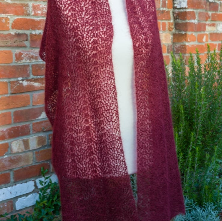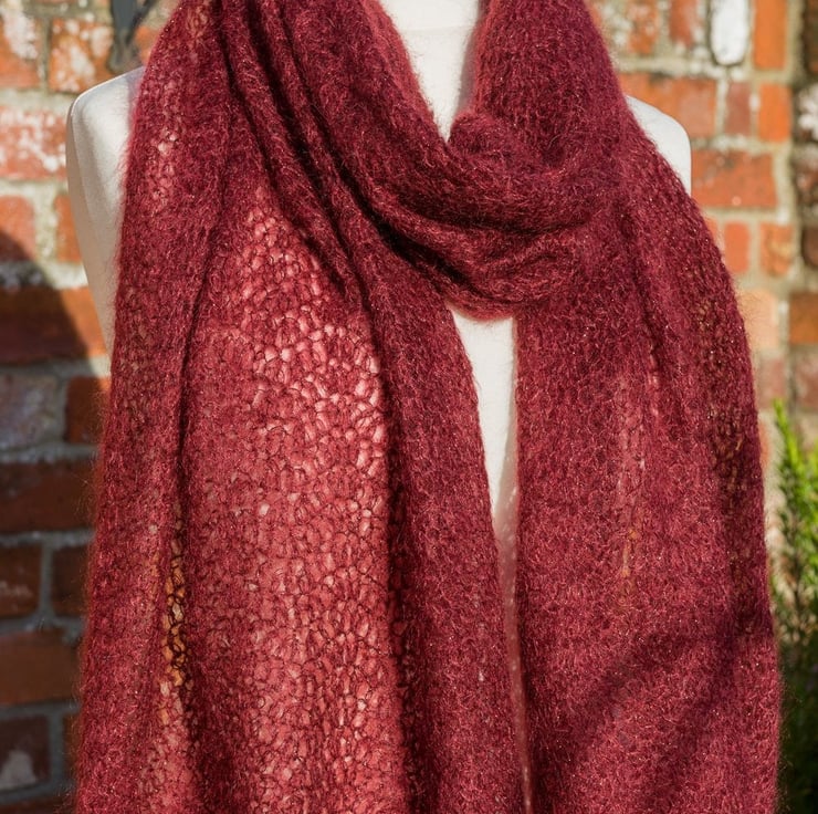 The wrap is a generous size at 200cm (79 inches) long and 45cm (18 inches) wide and is made with a yarn blend of mohair and silk, which, despite the lace crochet design, is very warm.