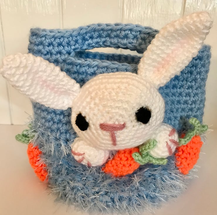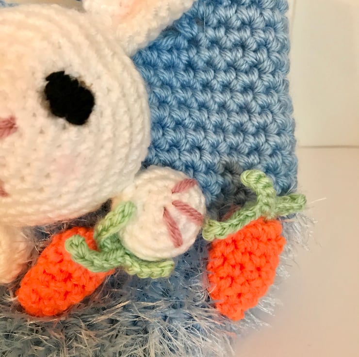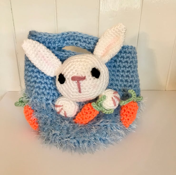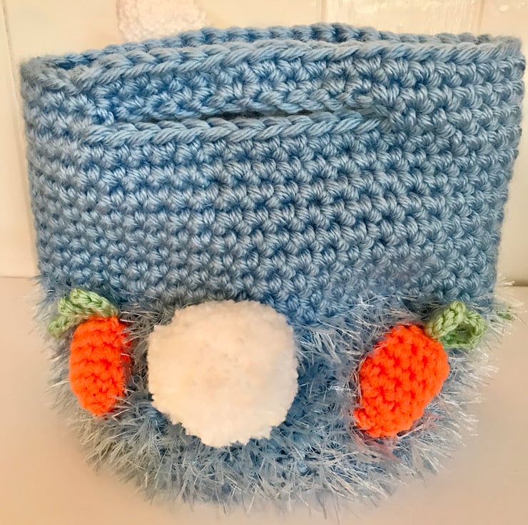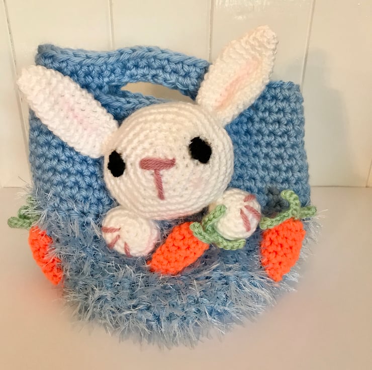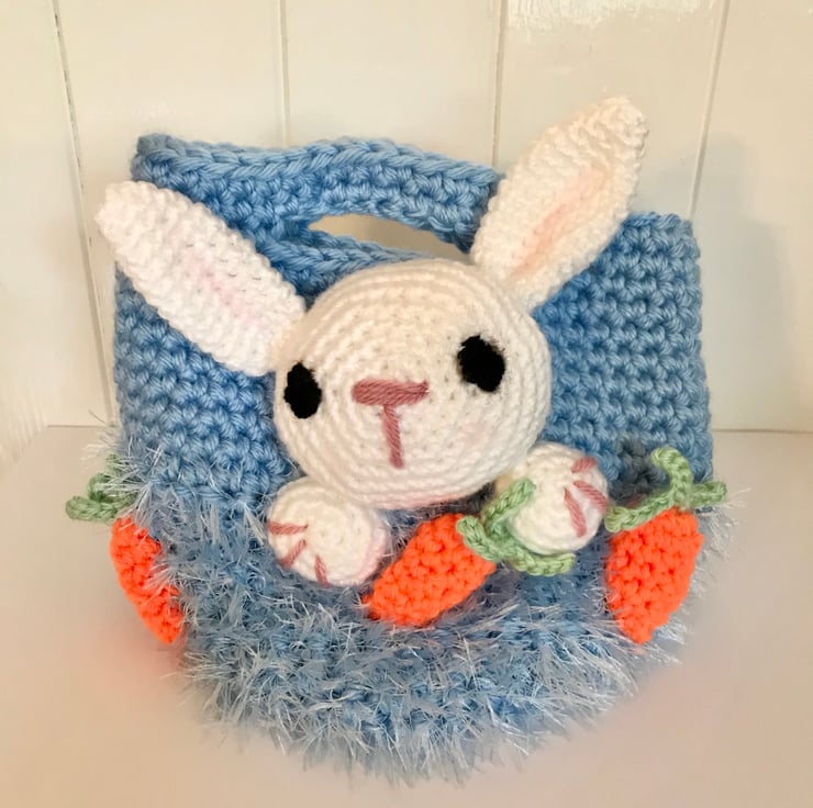 This cute Easter basket / bag is just perfect for collecting eggs and chocolate at the Easter Egg Hunt, or for storing your favourite things at any time of year. Standing approximately 8" tall it is perfect for any child from 18 months upwards. The rabbit's eyes are embroidered on rather than using safety eyes. The bag is made in Aran weight yarn and has faux fur yarn around the bottom for added effect and texture. Small carrots have been crocheted and appliqued afterwards to add colour and interest.