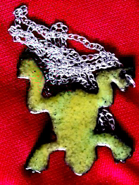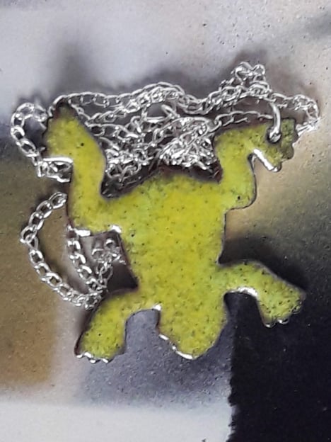 I have made this simple frog pendant by laying a coat of yellow-green enamel on layers of clear enamel fired over the copper base. The frog measures 30mm by 30mm at its tallest and widest. I have mounted the pendant on a 45cm, silver plate, curb chain that fastens with a simple bolt ring.