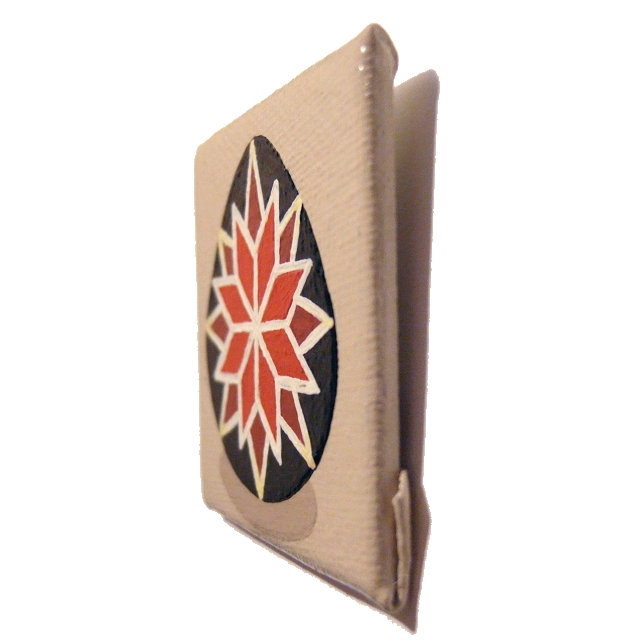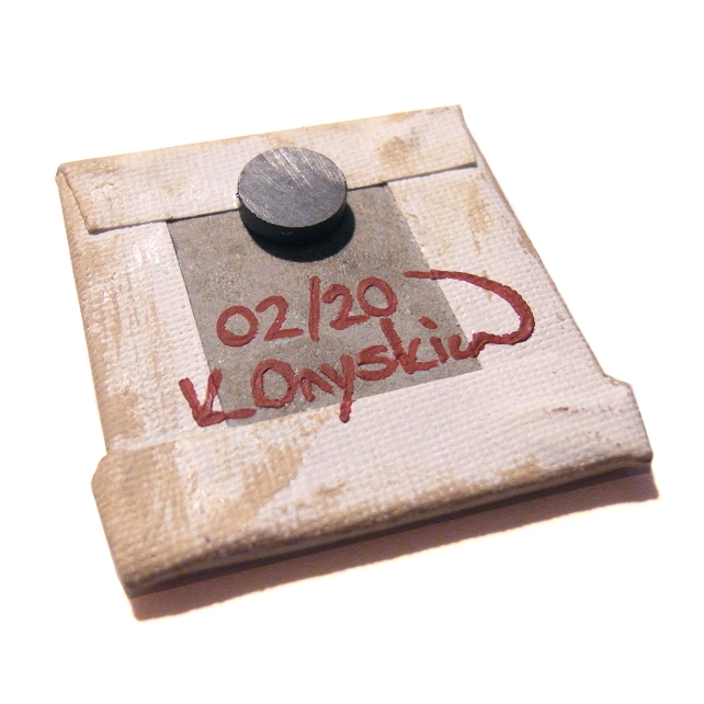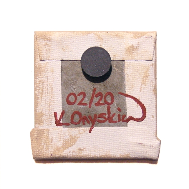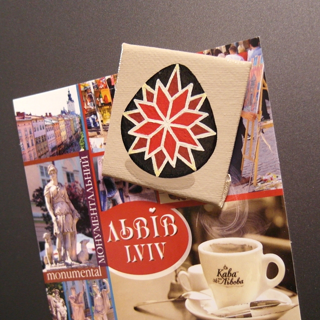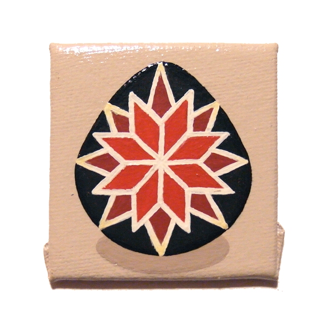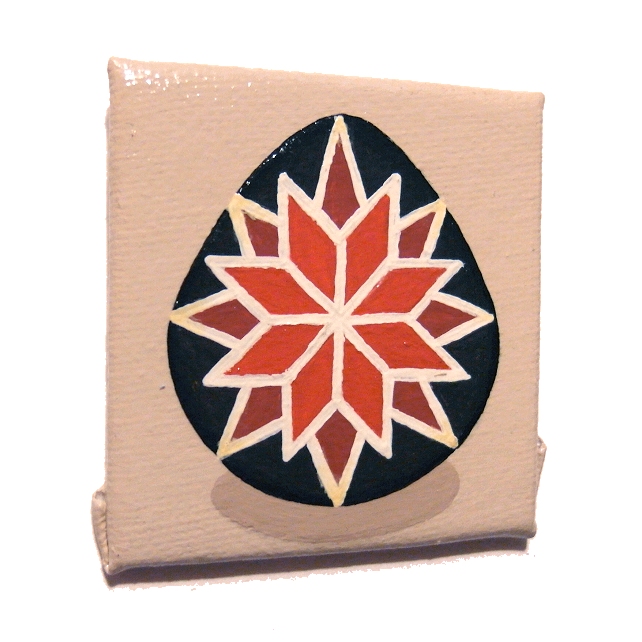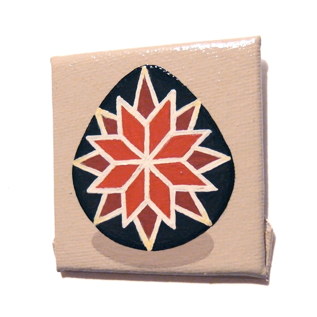 This original pysanky design by Kim Onyskiw is painted in acrylics on a 5cm x 5cm (2" x 2") canvas board, The mini art has been coated with a layer of clear varnish to make it more durable, and a 12mm magnet is attached to the back so the painting can stick on a fridge or other magnetic surface.
