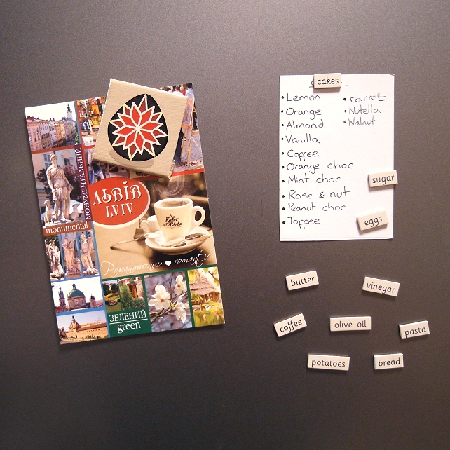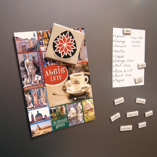 A hand painted magnet of a red and black pysanka - a traditional Ukrainian decorated egg. The colourful egg has been painted on a beige background.