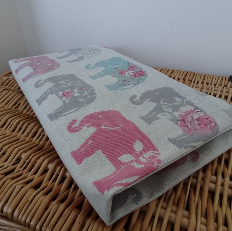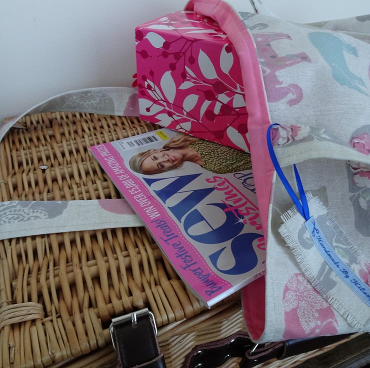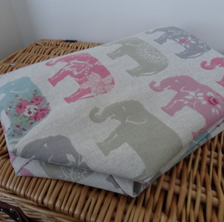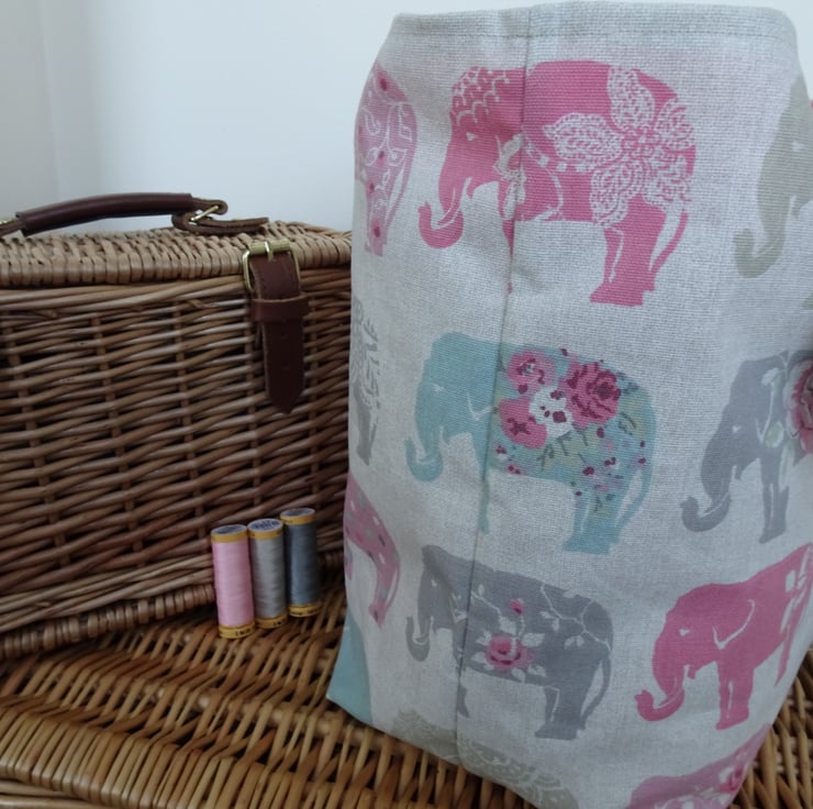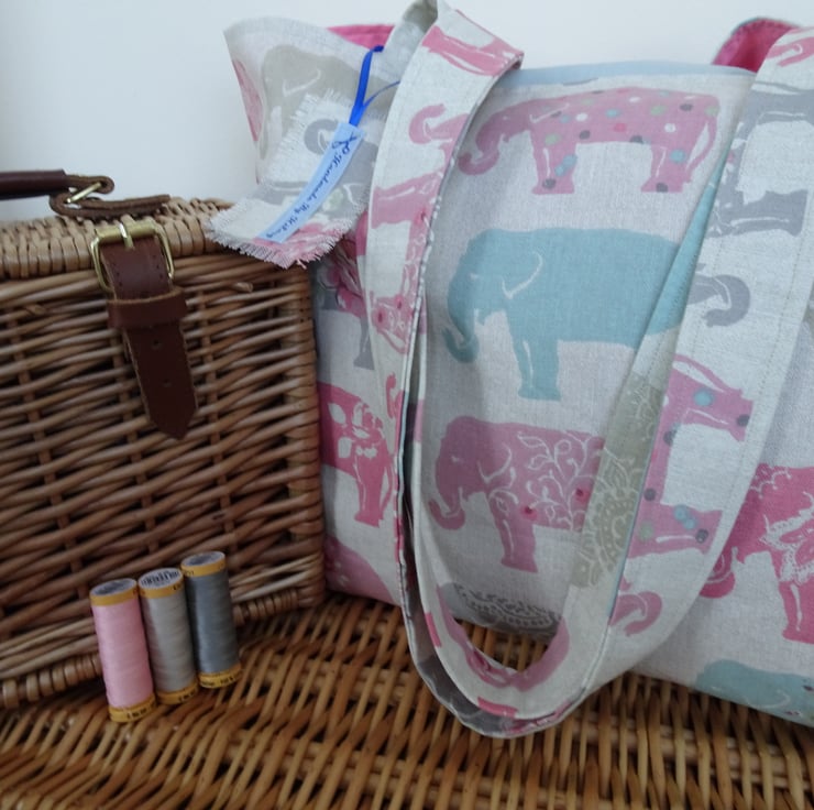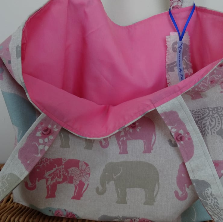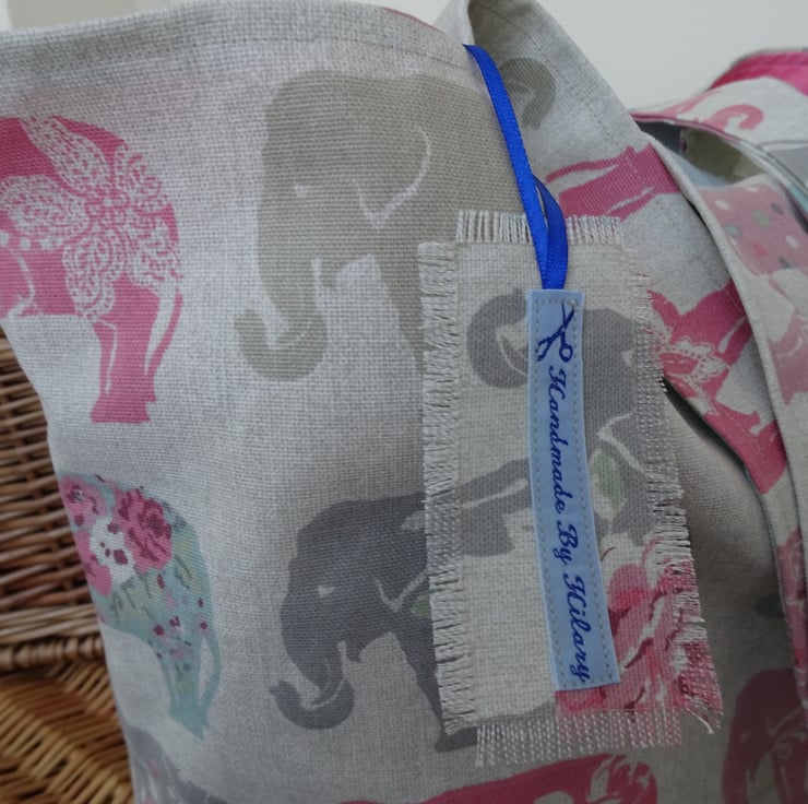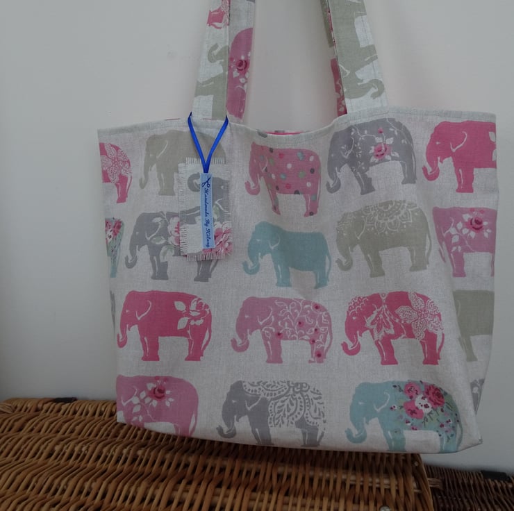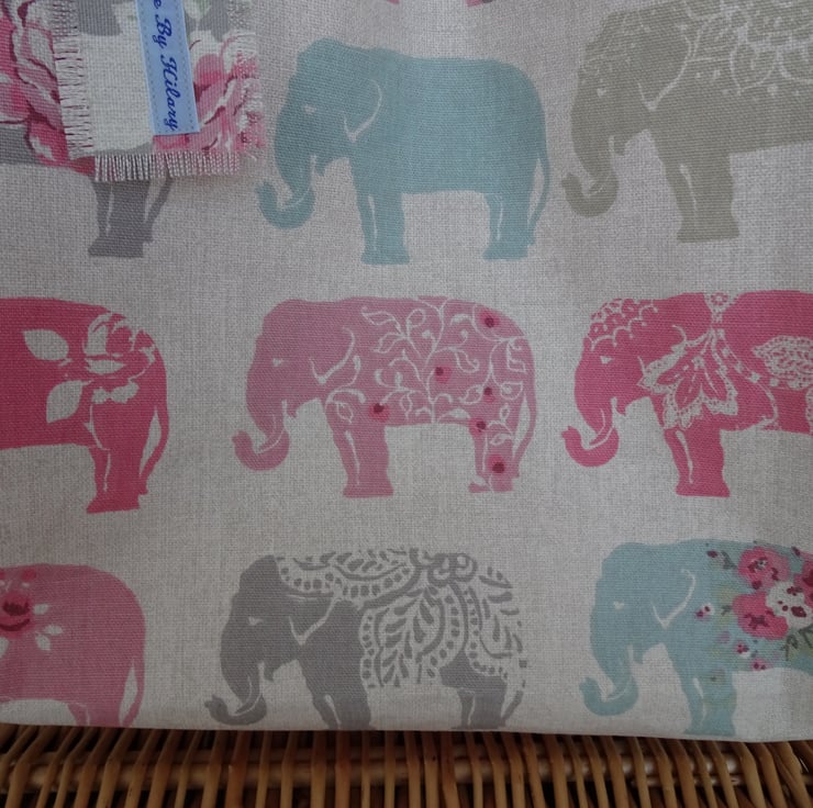 A fun and colourful cotton fabric reusable shopping bag, with a multi coloured elephant pattern. Lightweight and easily foldable, to fit in a medium size handbag or rucksack or use as your day shopping tote. With super strong, wide, shoulder length straps. Features a pink cotton lining to match the pink elephants.Dimensions: W32cm, H30cm, Handle length 38cm ,Handle width 3.8cm Gusset width 16cm