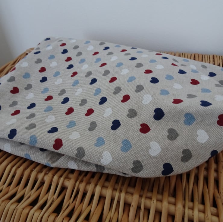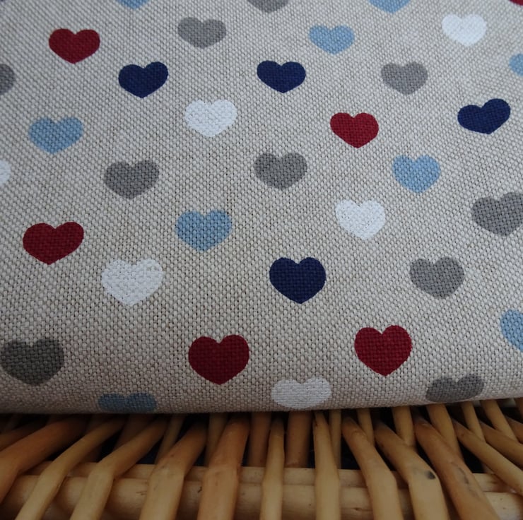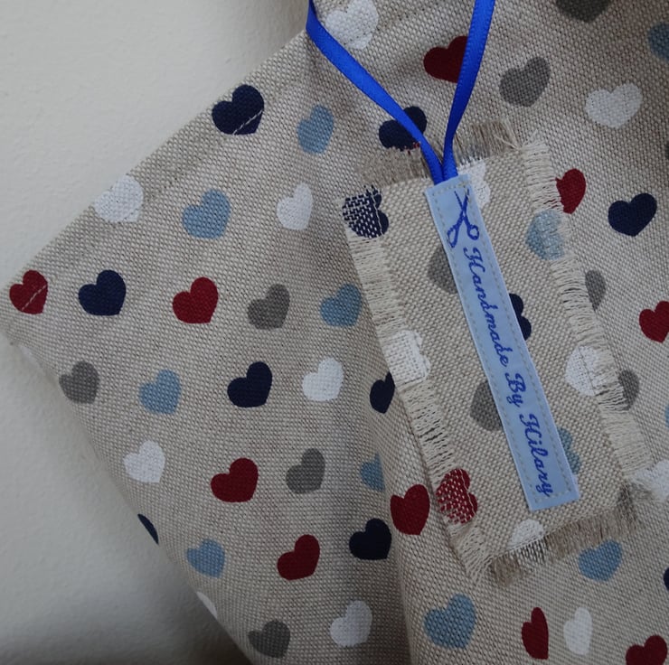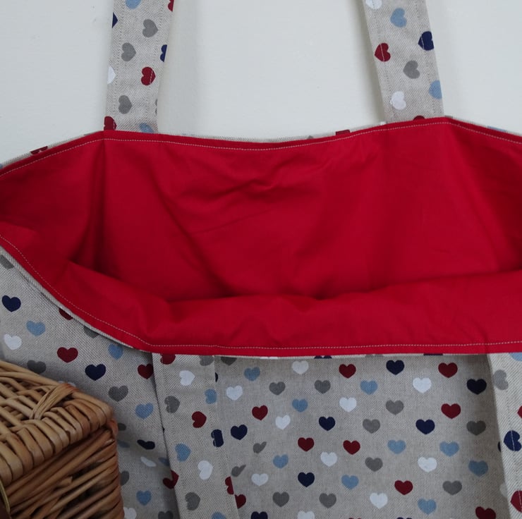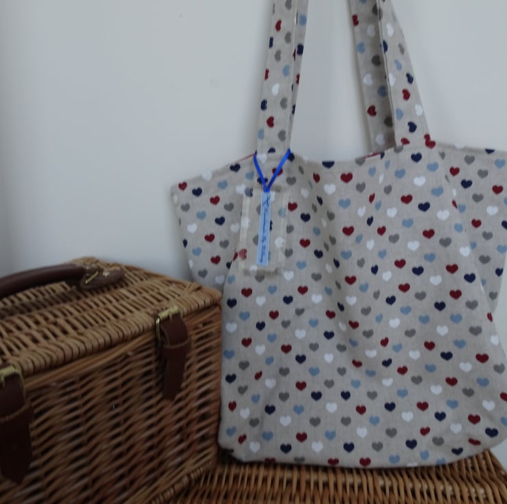 A fun and colourful cotton fabric reusable shopping bag, with a multi coloured hearts pattern. Lightweight and easily foldable, to fit in a medium size handbag or rucksack or use as your day shopping tote. With super strong, wide, shoulder length straps. Features a red cotton lining to match the red hearts.Dimensions: W32cm, H30cm, Handle length 38cm ,Handle width 3.8cm Gusset width 16cm