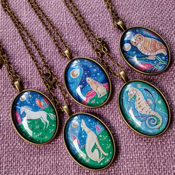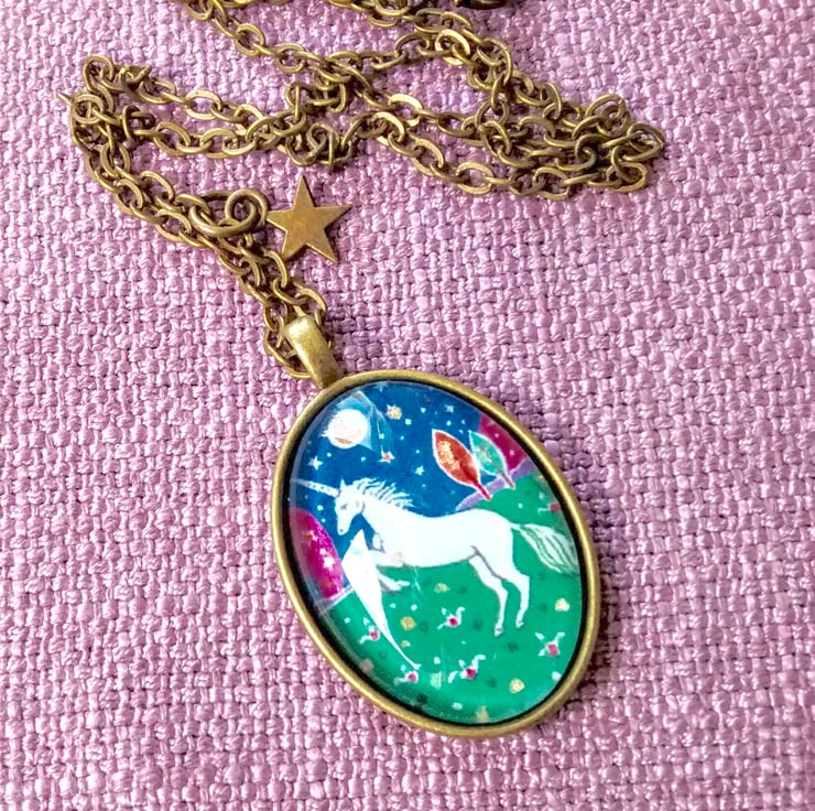 Was £11.00, now £8.00. Featuring my original painting of a prancing unicorn in a fantasy landscape, hand embellished with touches of gold, this beautiful little pendant has been has been suspended from a chain of bronze effect metal with a little star charm. Finished and protected with crystal resin and glass this piece of wearable art would be perfect little gift for Mother's Day or a birthday.