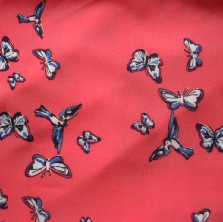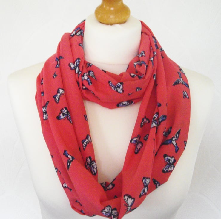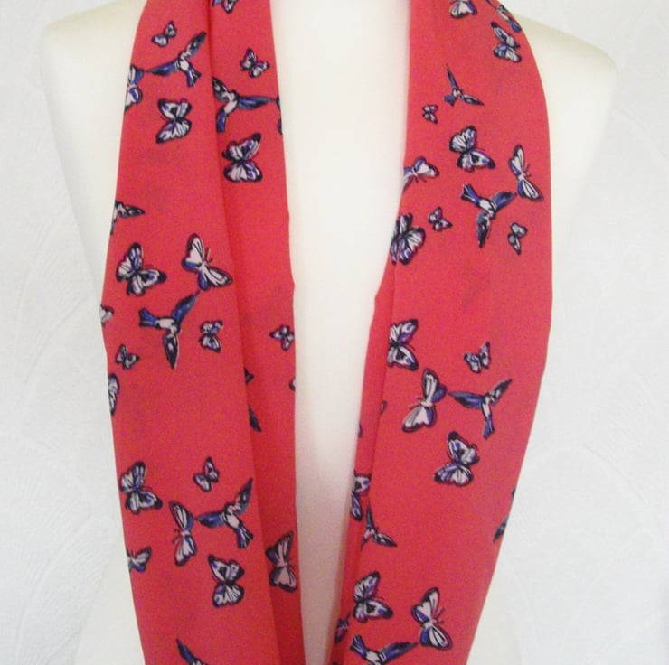 This is a hand made infinity scarf made from a beautiful deep coral powder soft (peach skin feel) chiffon fabric with a really pretty birds and butterflies print. Although described as chiffon, this is not a particularly sheer fabric and it has a lovely drape to it. This coral shade is really striking! Only one of this scarf available as my fabric supplier has sold out....so this one may not be repeated (although I keep checking!)
