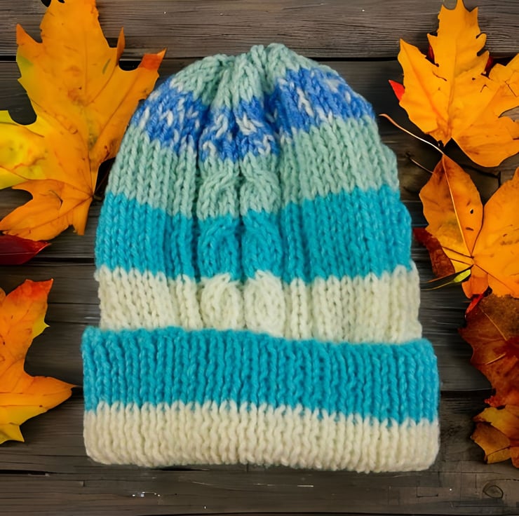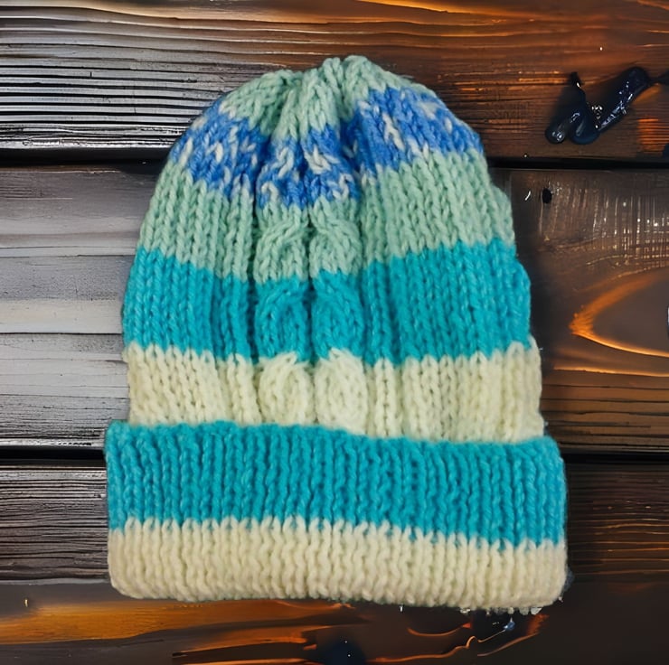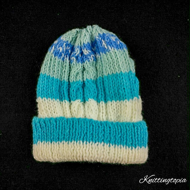 Warm baby hat hand knitted using aran yarn in a blue and cream mix which forms a striped pattern as you knit. The hat has a double cable pattern.