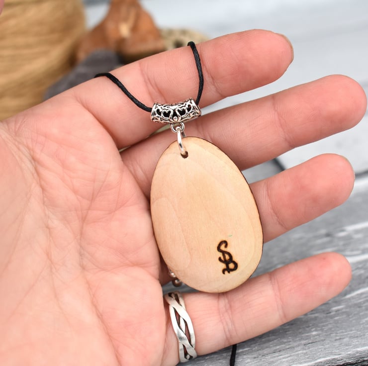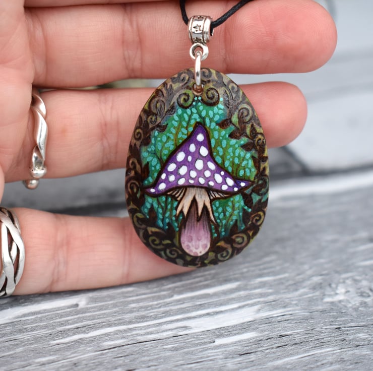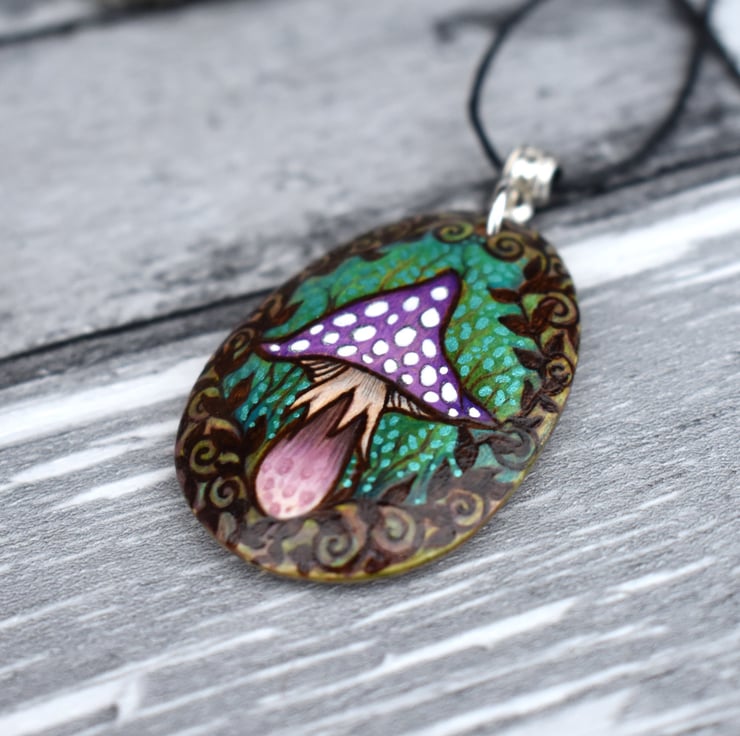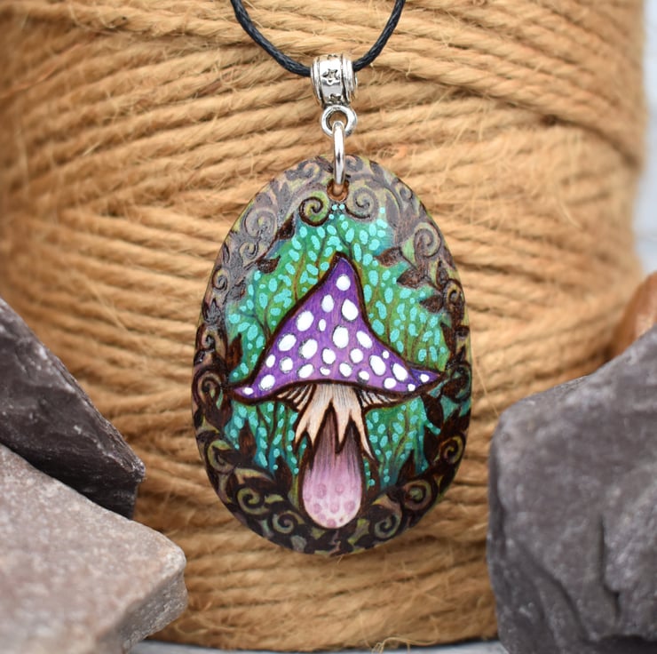 A stylised purple toadstool is featured on this teardrop pendant, with a lush forest background with leaves and swirls. Hand burned using pyrography or wood burning. Ideal for a nature lover's birthday or for a five year wood anniversary gift.