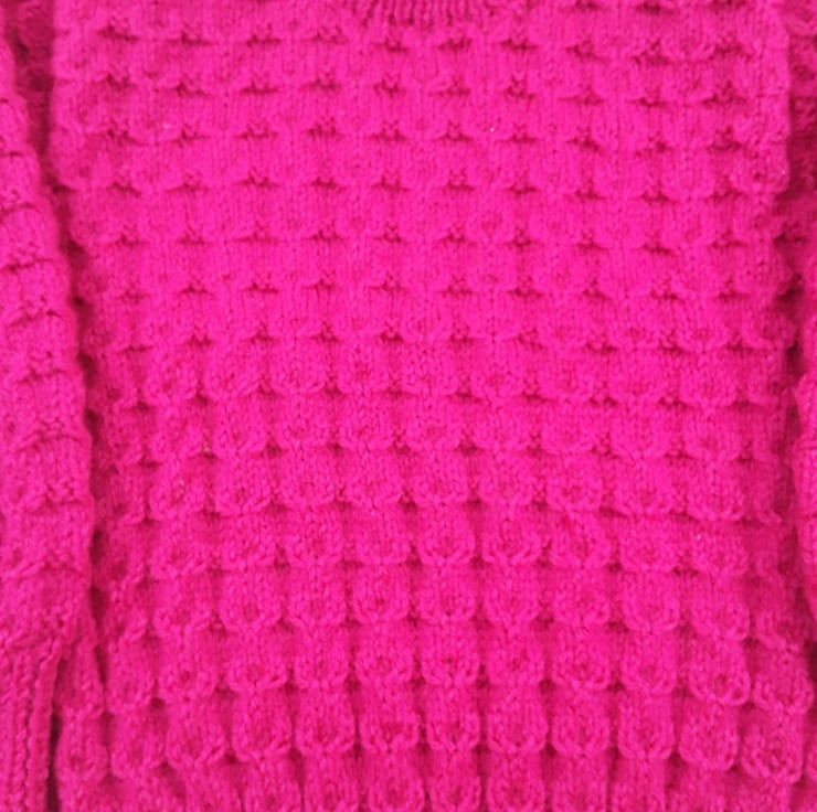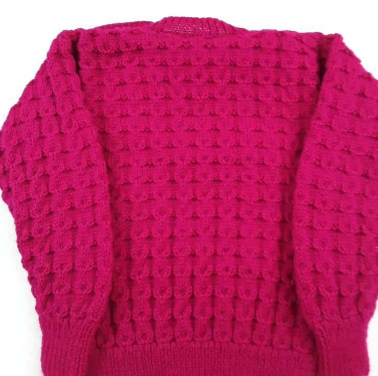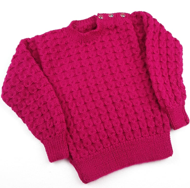 This hot pink baby jumper has been hand knitted with an all over textured cable pattern. It features a round neckline and fastens on the left shoulder with buttons. A great addition to any little girls wardrobe.