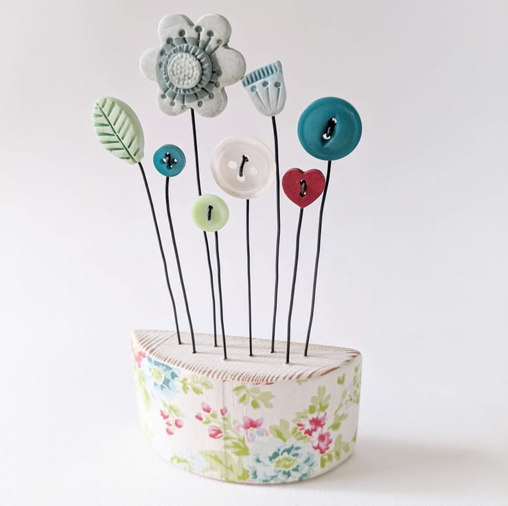 Button and clay flowers grow in this flower garden, standing on their wire stalks in a curved and decoupaged wood block.