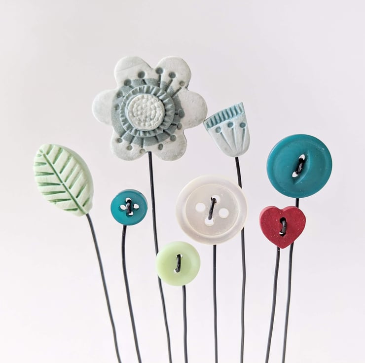 There are vintage button flowers and a large clay flower with leaves made from polymer clay. This is hand moulded, fired and painted to finish.