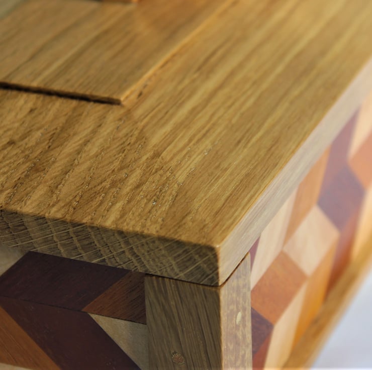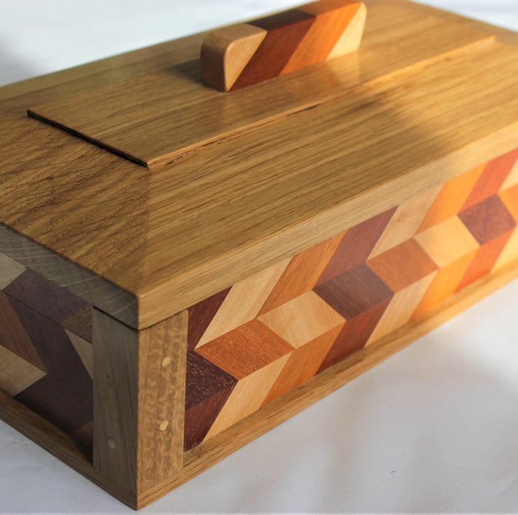 It is made from a number of solid hard woods With a solid oak lid. This could be used as a Jewellery or trinket box but probably more the later.