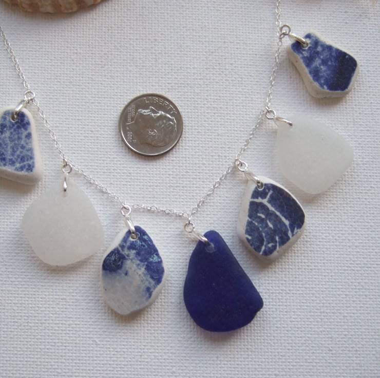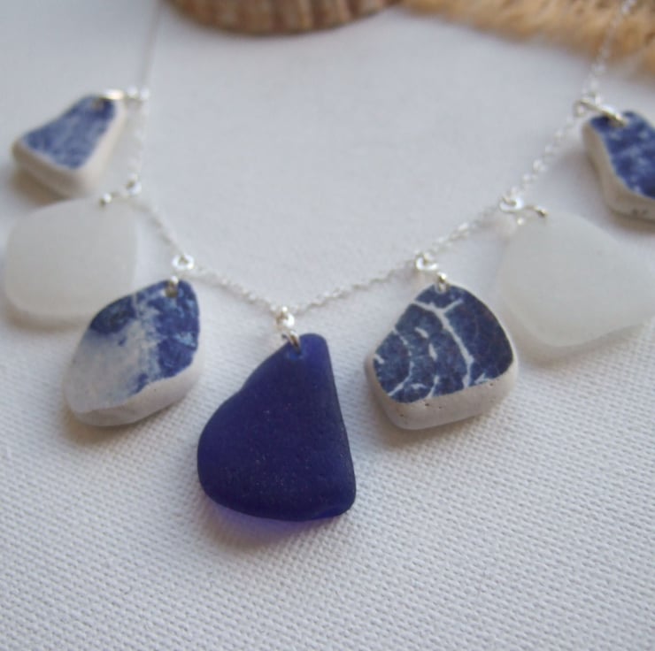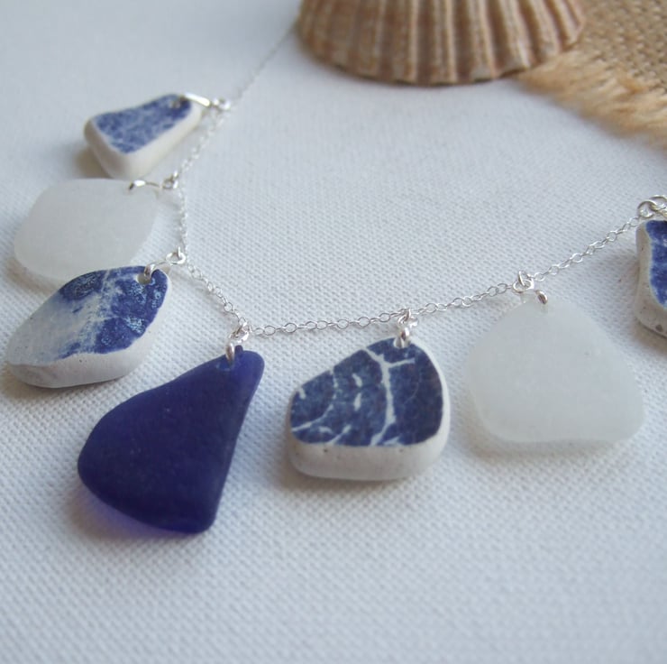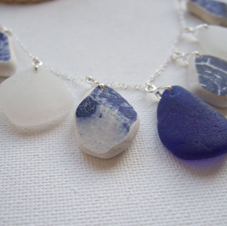 Lovely maritime mix of blue and white Scottish sea glass paired with blue Scottish sea pottery. Multiple pendants on an outstanding necklace that you will not find a second one of!