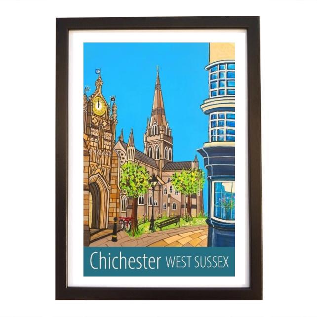 A contemporary travel poster style print of the Cathedral and Chichester Cross, in the centre of Chichester, West Sussex, from my own original acrylic painting.