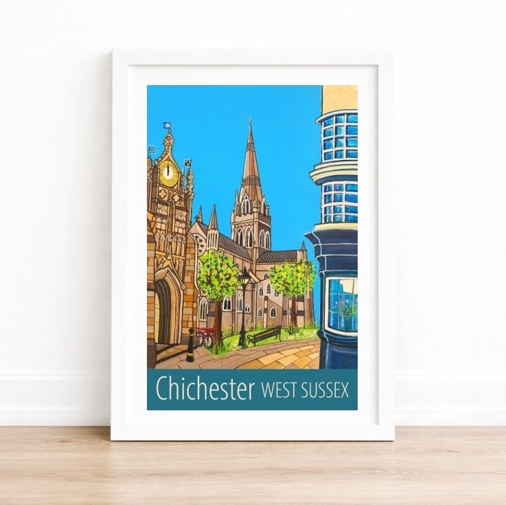 A contemporary travel poster style print of the Cathedral and Chichester Cross, in the centre of Chichester, West Sussex, from my own original acrylic painting. A perfect gift for those who love Chichester!