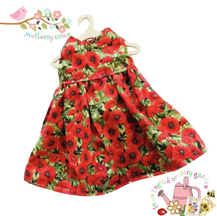 A sweet little dress, covered in poppies to fit the Mulberry Green characters. The dress is made from best quality cotton, has a full skirt, a lined bodice and comes on a cute little wooden hanger.