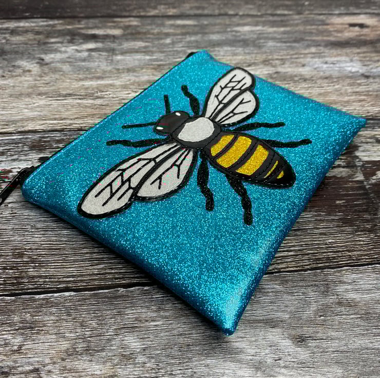 A glittery coin purse pouch with an appliqué "bee“ design to the front.