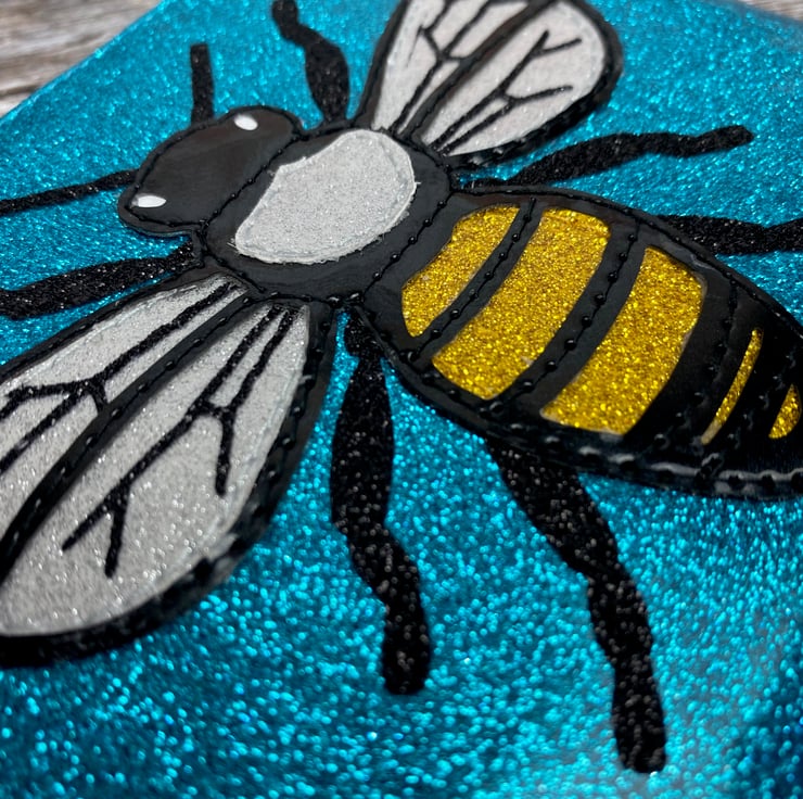 The exterior is turquoise with a white, silver and black bee appliqué graphic to the front and turquoise glitter vinyl to the back. The pouch is fully interfaced and lined in a green and white leaf design cotton fabric and a black zip.