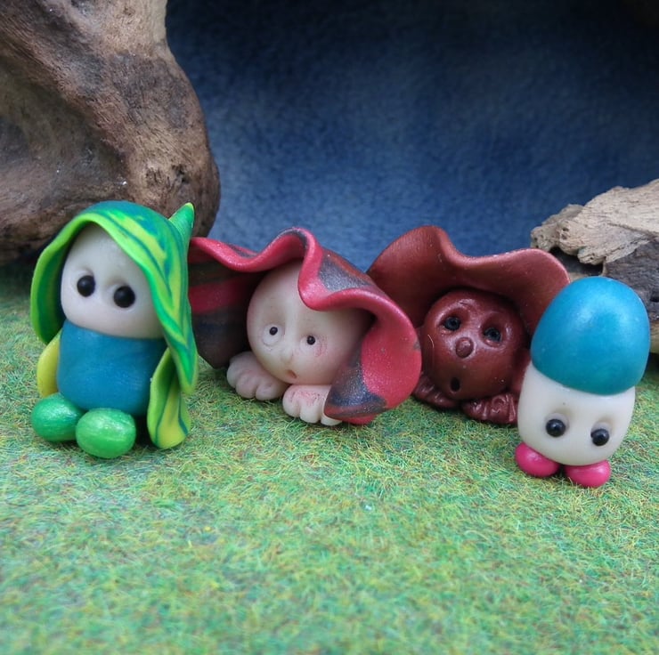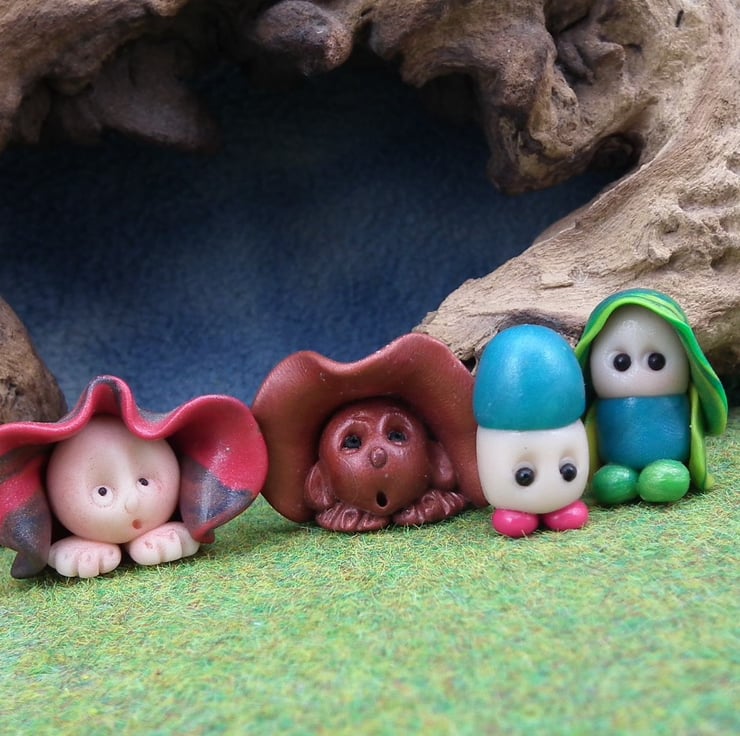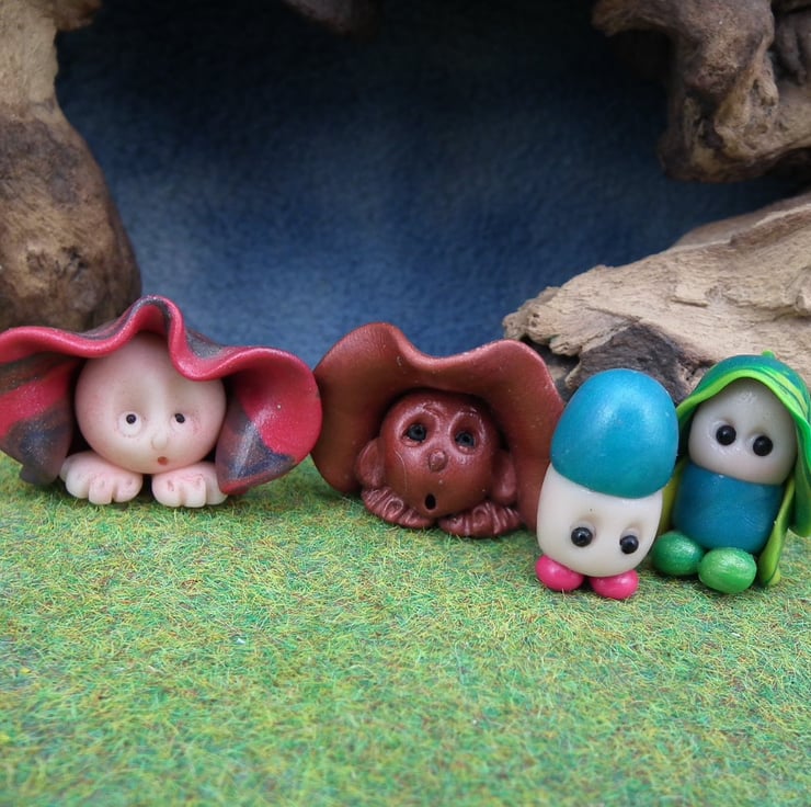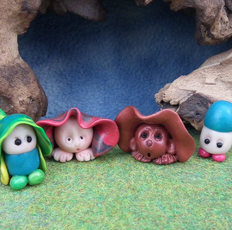 These are 'one of a kind' creations having been entirely handmade without the use of moulds here at my studio on the Sussex Coast. Modelled with Prosculpt polymers, painted with heat set paints before sealing with lacquer, all four have sparkling black glass eyes. You will be purchasing the four Gnomes for this bargain price.