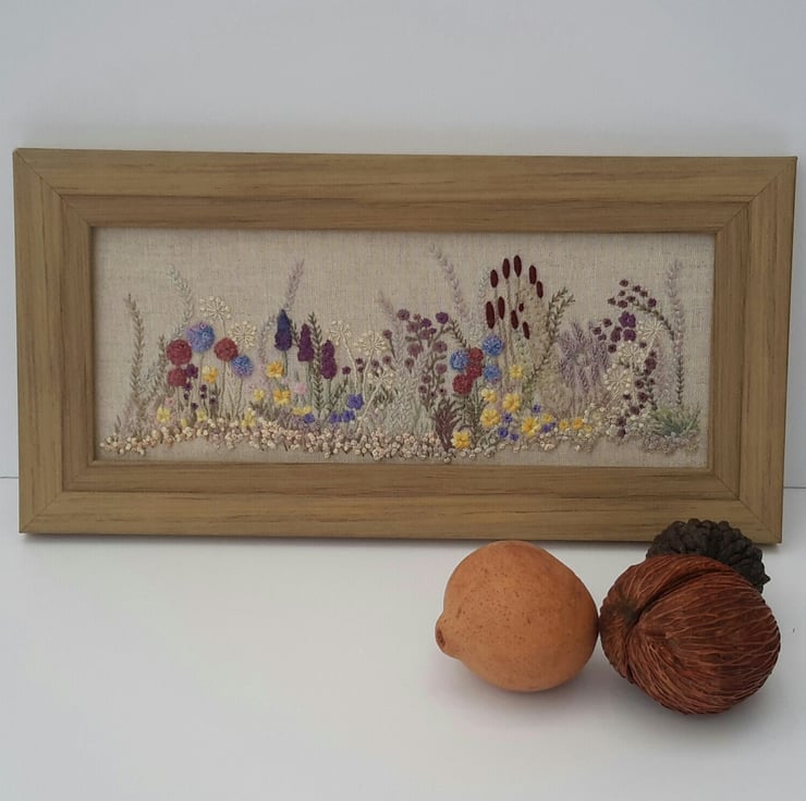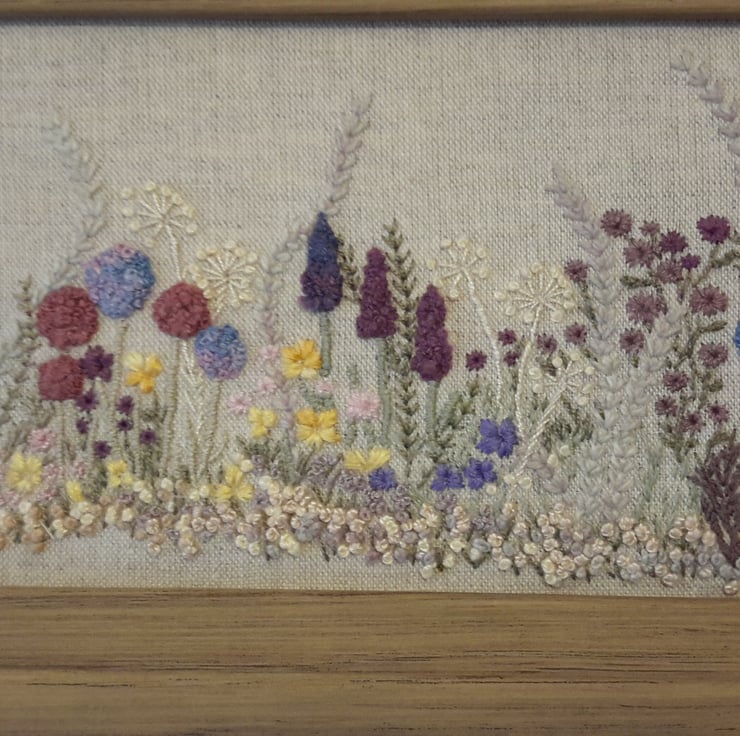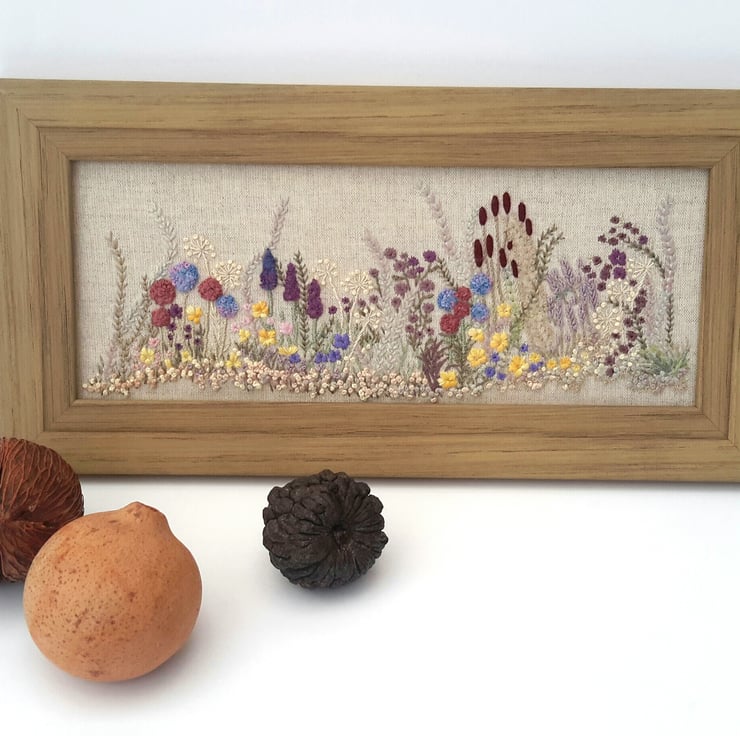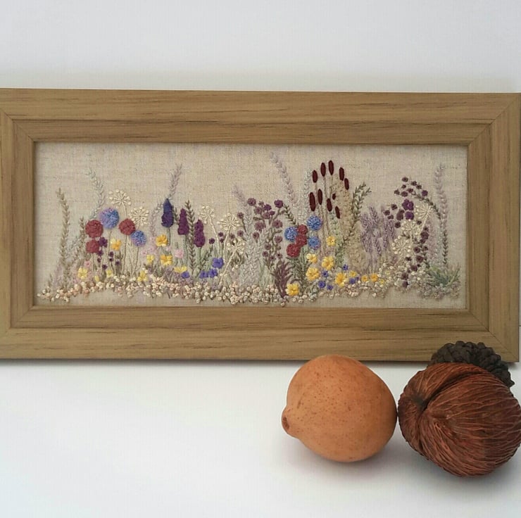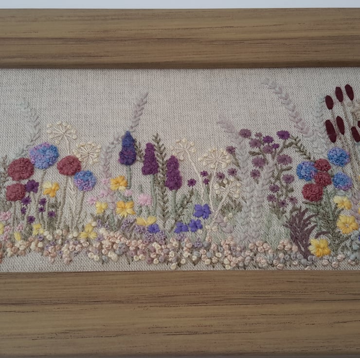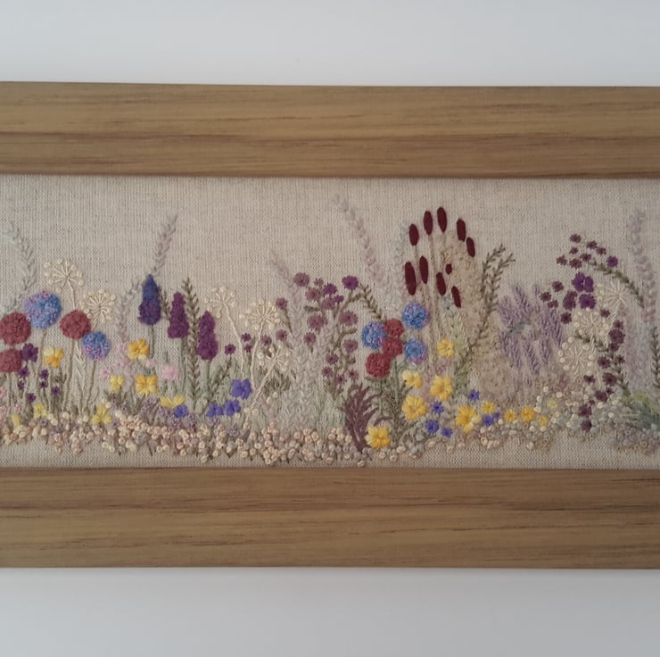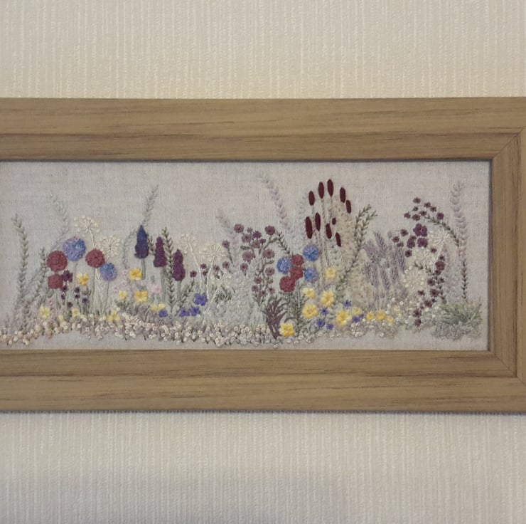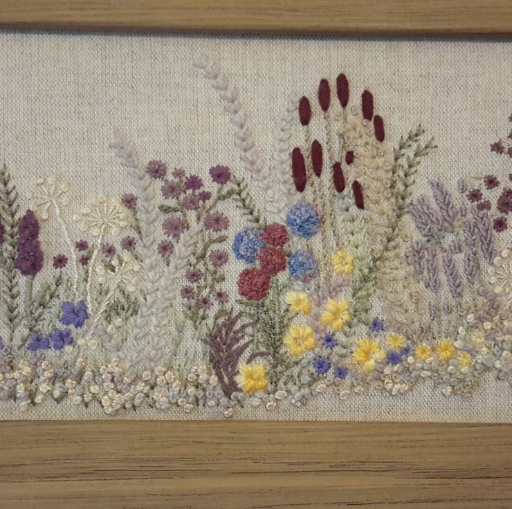 A one off piece, hand embroidered flowers and hedgerow, a spring/summer border of various flowers and grasses.