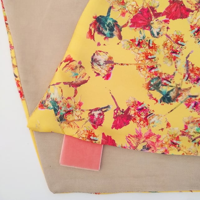 Printed onto faux silk by a company in the UK, it is fully lined in a taupe satin sheen cotton with a velvet loop.