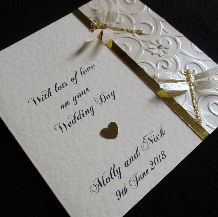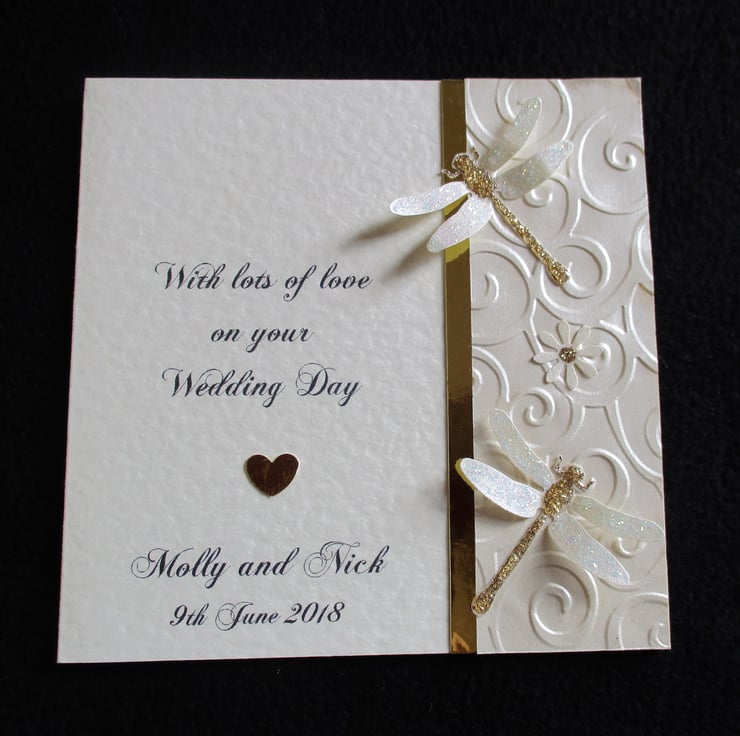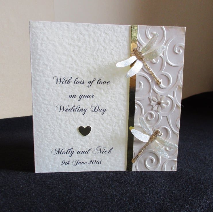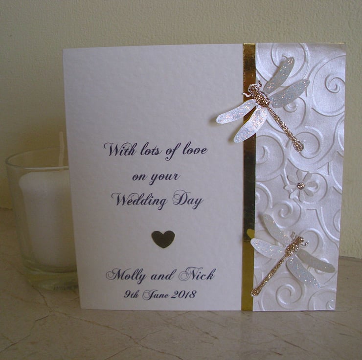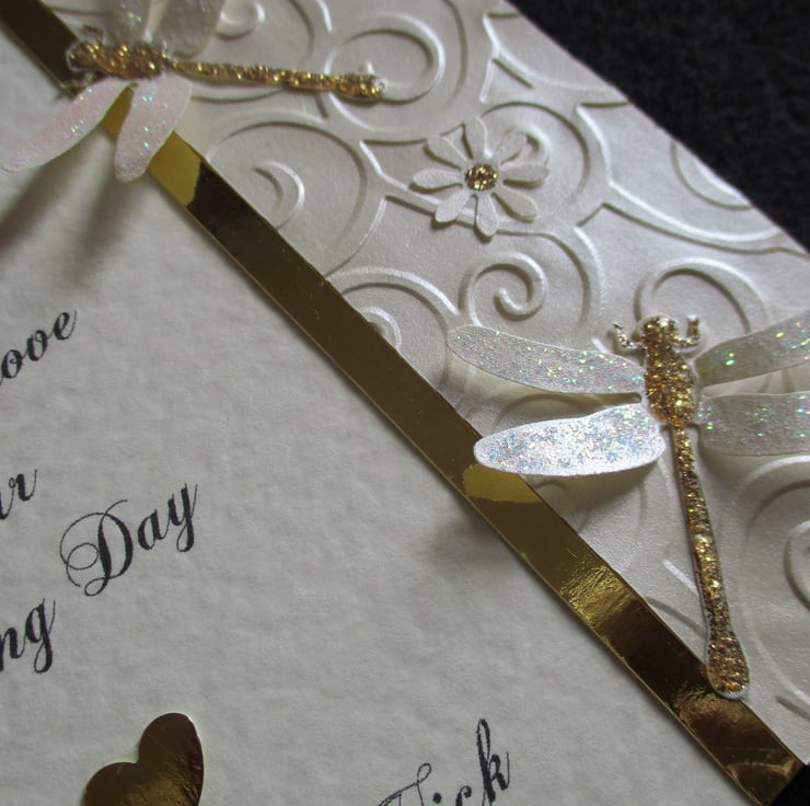 Sparkly Ivory and Gold dragonflies personalised wedding card.