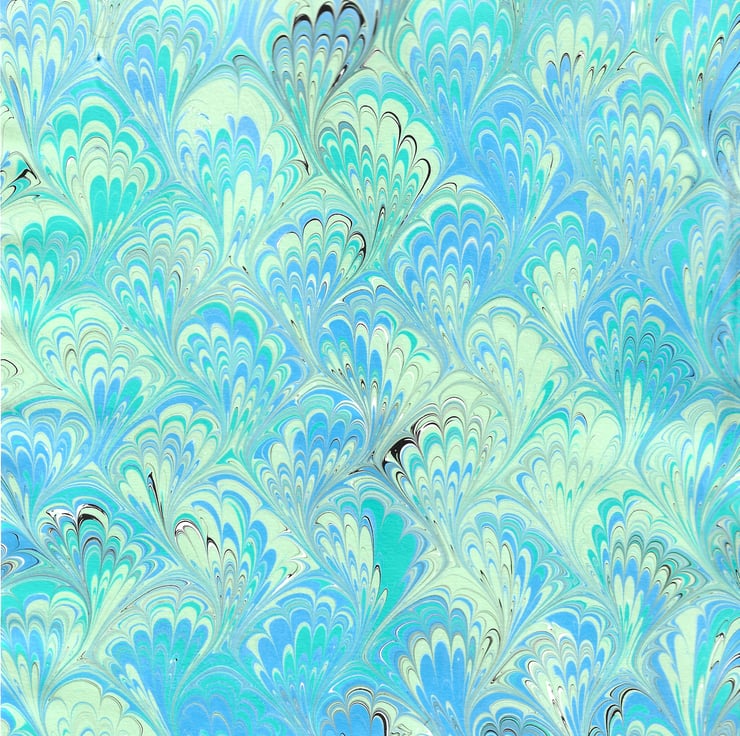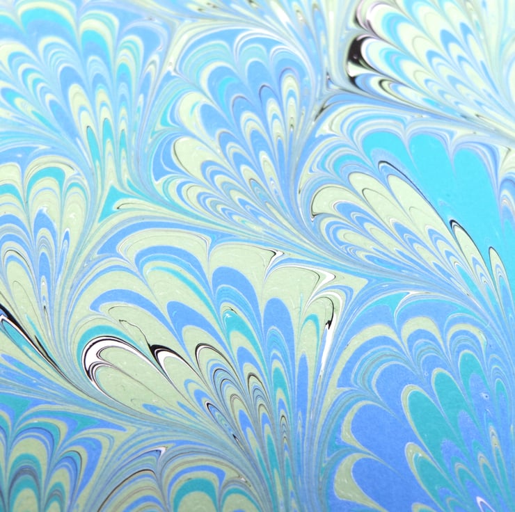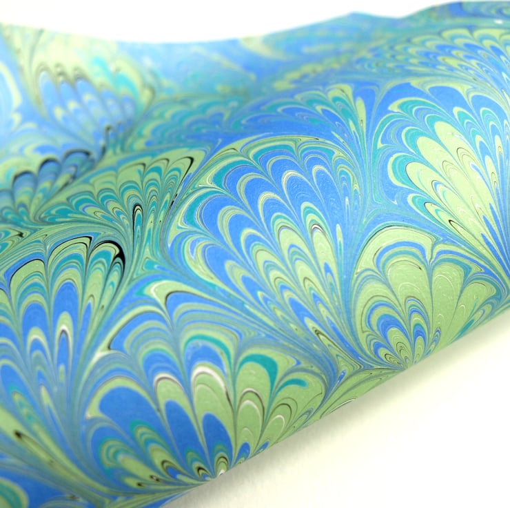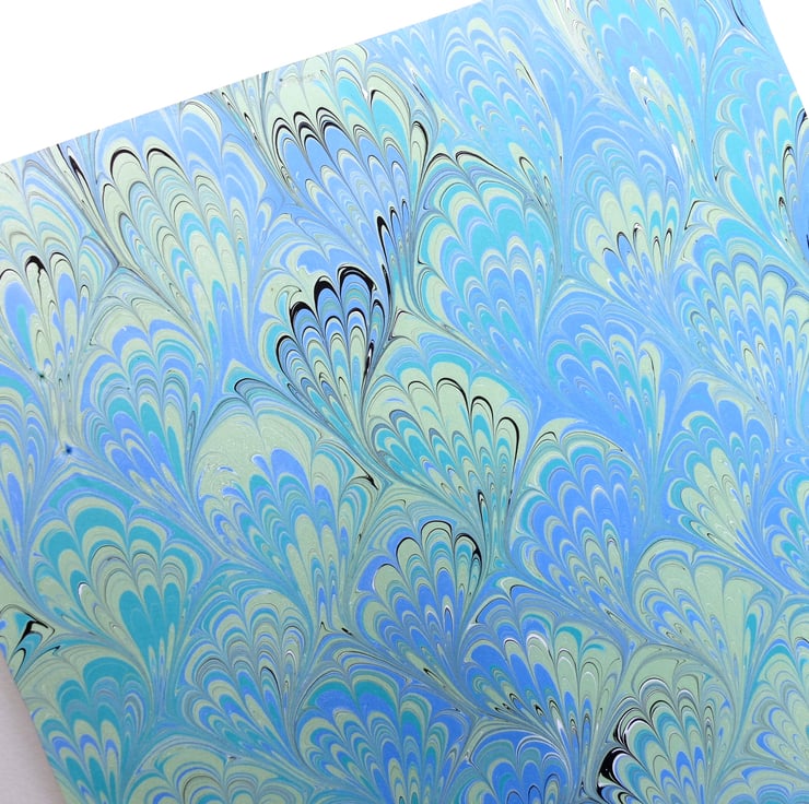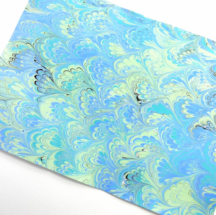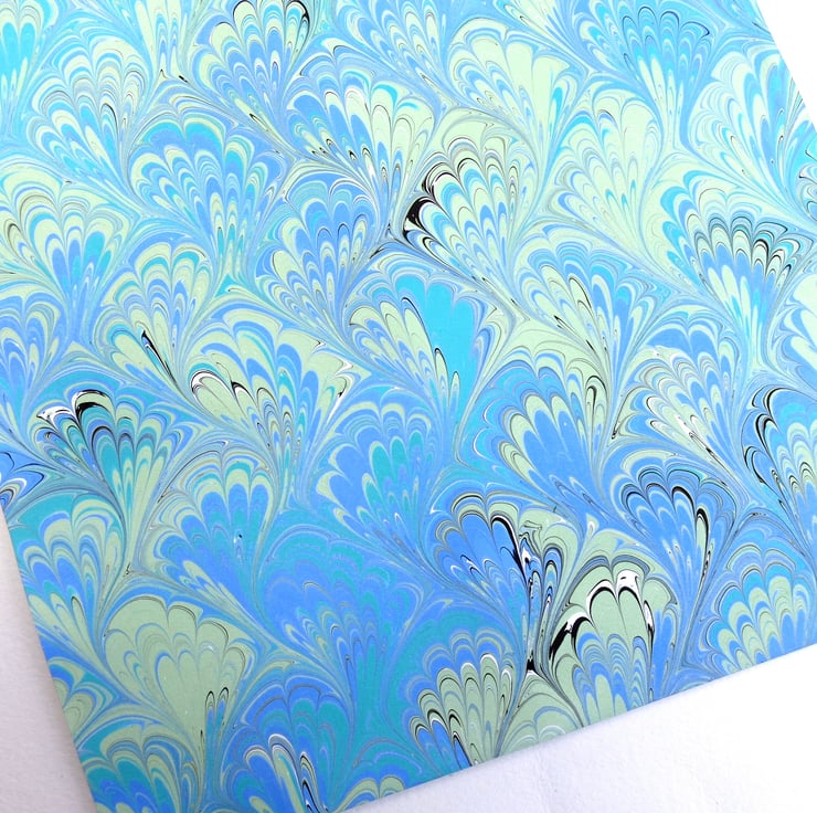 This unique sheet is marbled in blue and greens onto 140gsm FSC and ECF paper (please see my about section for more details on the papers).
