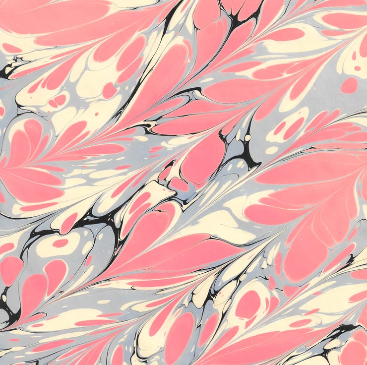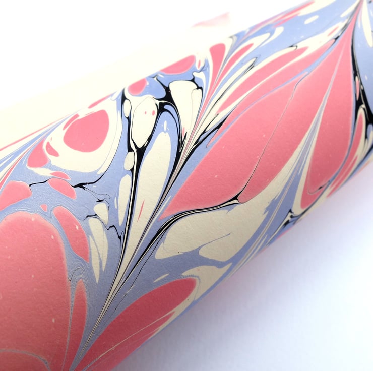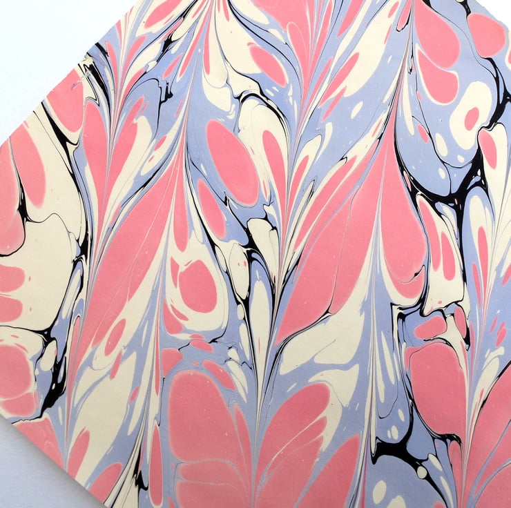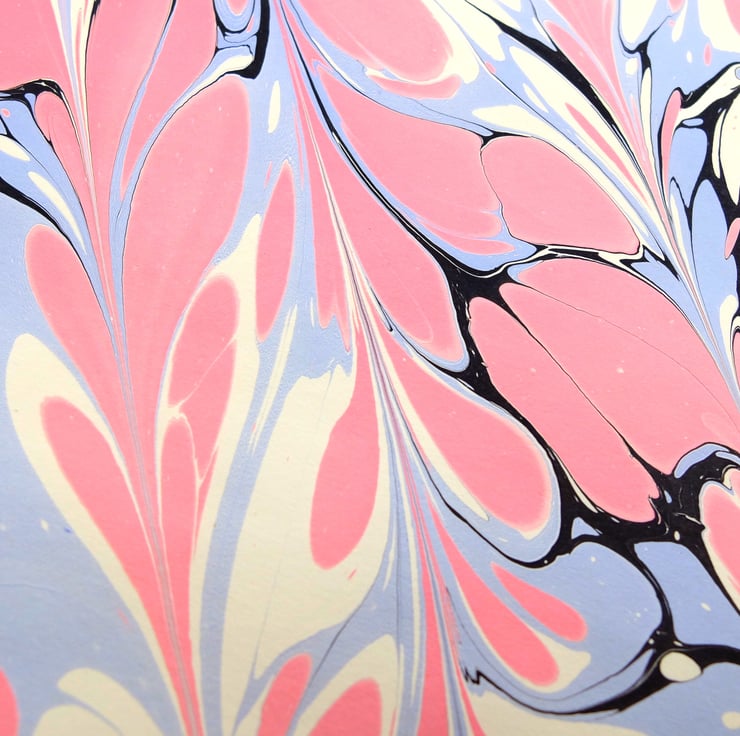 This unique sheet is marbled in blue, crimson pink, cream and black onto 120gsm FSC yellow base paper (please see my about section for more details on the papers).