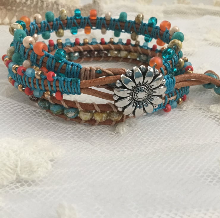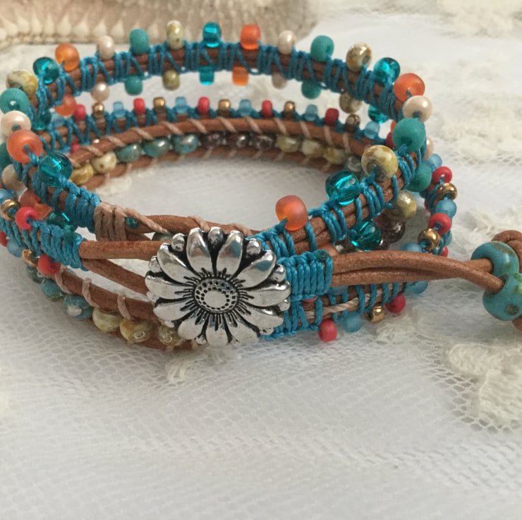 The colours I have used in this particular bracelet are a lovely summery combination of coral, turquoise with some natural and gold hints. All the beads are of the best quality Miyuki from Japan and the leather is gorgeous soft 1.5mm Italian leather.