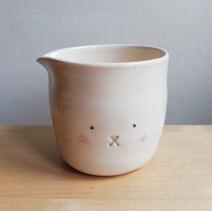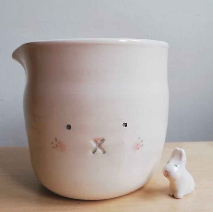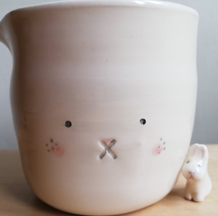 Hand thrown pottery bunny jug with hand painted face and little 3D cotton tail.