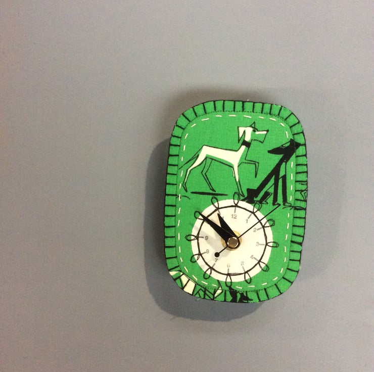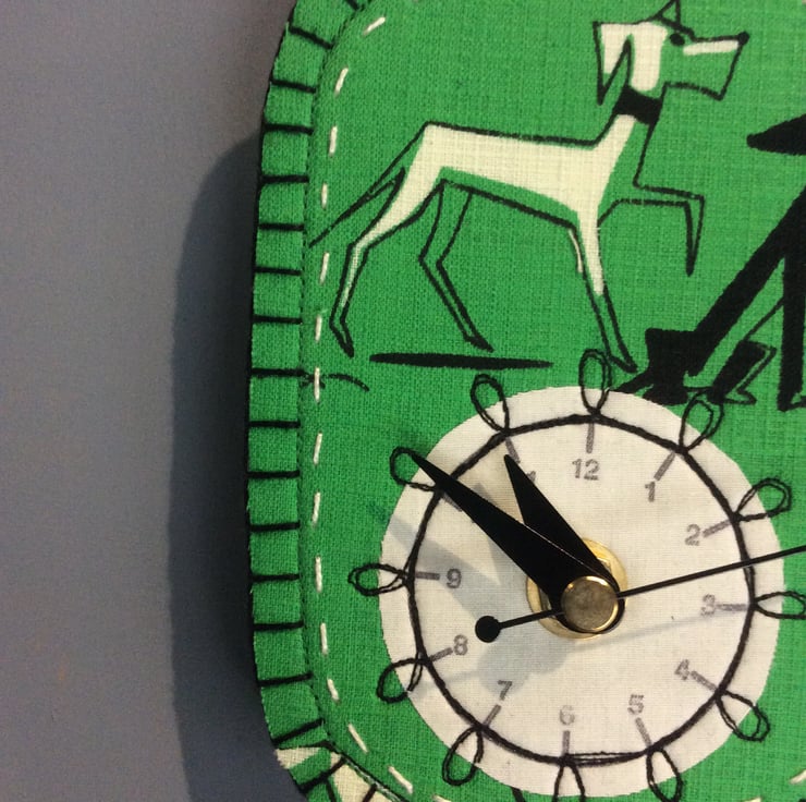 I’ve been making clocks from vintage fabrics for about a year, but they are usually abstract. This fabric shouted (woofed actually) at me to be clocks!