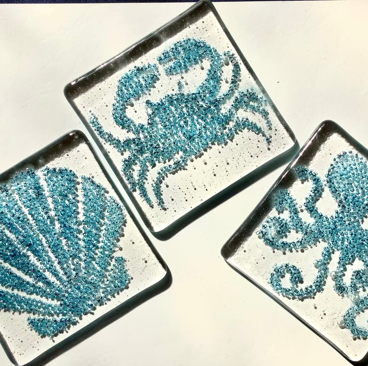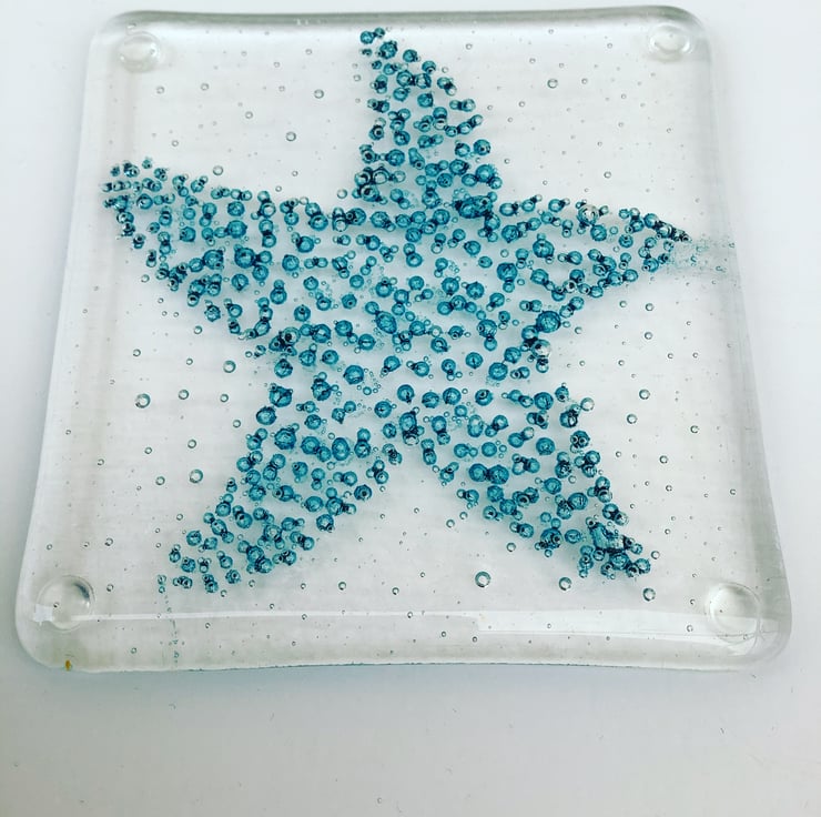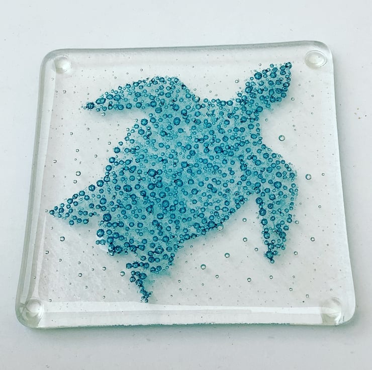 10cm x 10cm fused glass whale tail coaster. I have drawn a whale tail on a sheet of clear glass, applied copper oxide to create the bubbles and sandwiched the copper oxide between two sets of glass. The coaster has then been fired in a kiln to create the bubbles and give it a smooth finish. 4 bumpers have been applied to the bottom of the coaster to protect your surfaces.