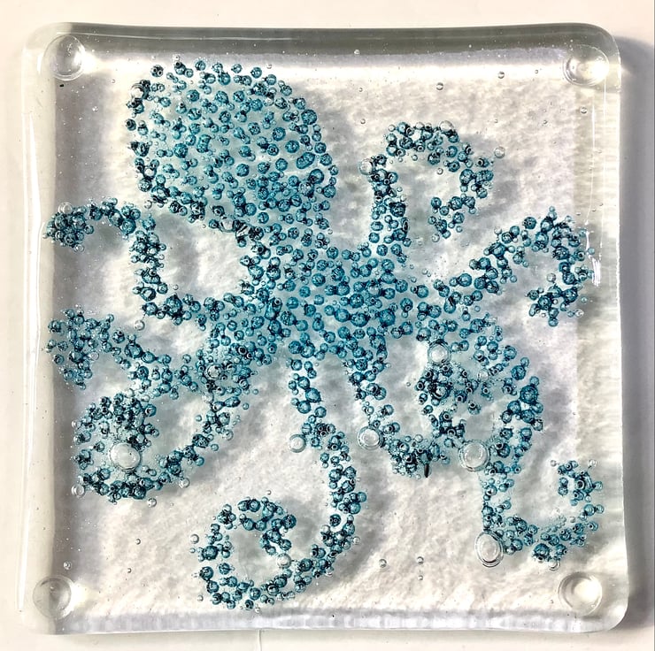 10cm x 10cm fused glass whale tail coaster. I have drawn a whale tail on a sheet of clear glass, applied copper oxide to create the bubbles and sandwiched the copper oxide between two sets of glass. The coaster has then been fired in a kiln to create the bubbles and give it a smooth finish. 4 bumpers have been applied to the bottom of the coaster to protect your surfaces.