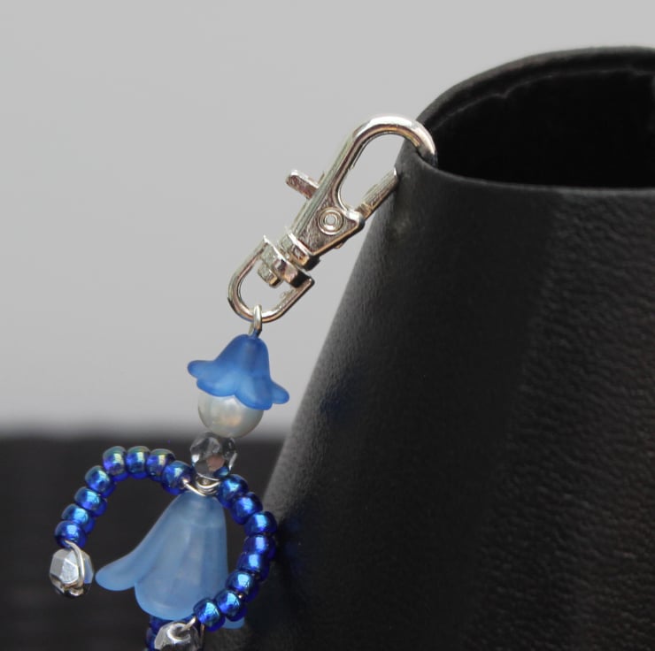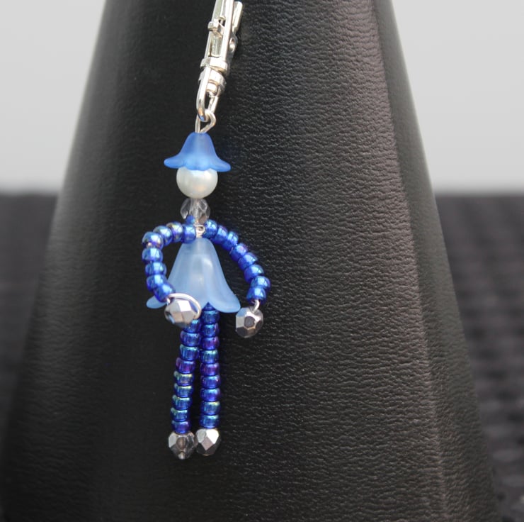 Blue fairy charm with trigger clasp with blue seed beads acrylic hat and skirt and grey crystal hands and feet 2" dangle length will come gift wrapped