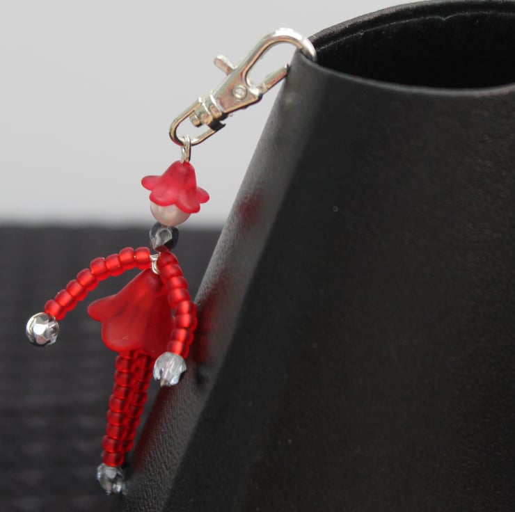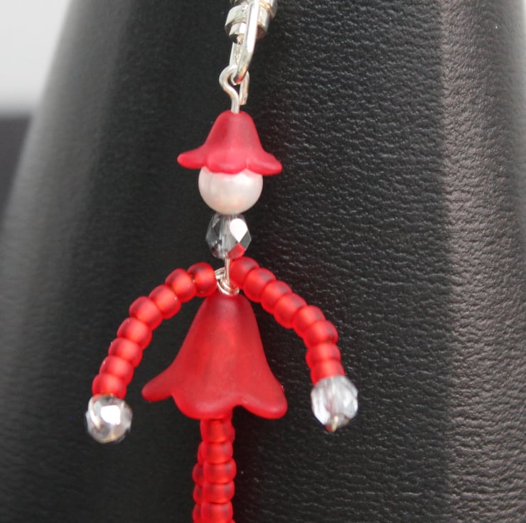 Red fairy charm with trigger clasp with red seed beads acrylic hat and skirt and grey crystal hands and feet 2" dangle length will come gift wrapped.