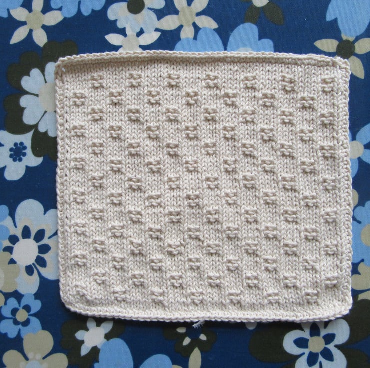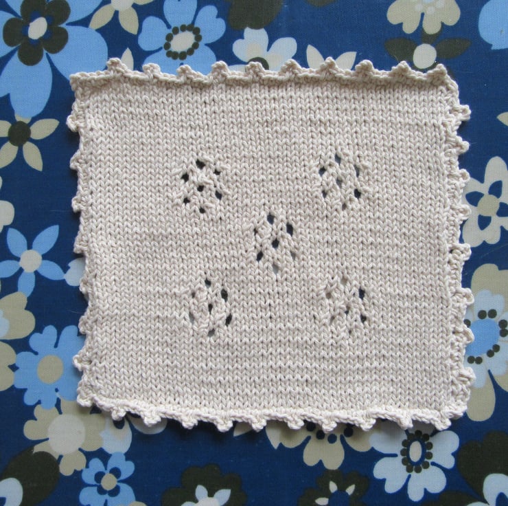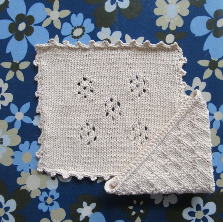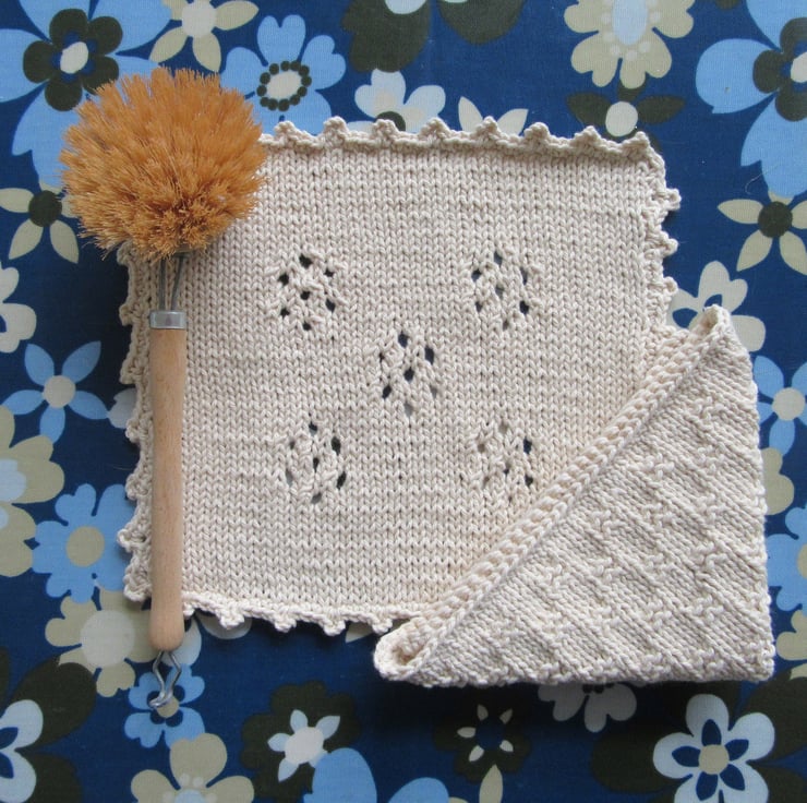 A pair of unbleached 100% cotton hand knitted dishcloths. One cloth is knitted in smooth stocking stitch with five eyelet flower motifs in the centre and bound in a crocheted picot edging, in the same unbleached cotton. The other dishcloth is knitted in a basket weave stitch and again bound in unbleached cotton crocheted edging. Perfect in the kitchen or bathroom, or indeed as a face cloth. Eco dishcloths as they can be washed on a 30' wash cycle and can be used repeatedly.