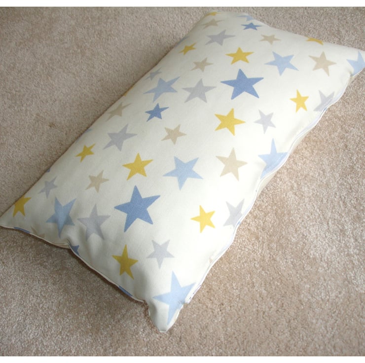 Stars in Blue, Yellow, Grey and Beige. Perfect for travel or a small lumbar nursery pillow
