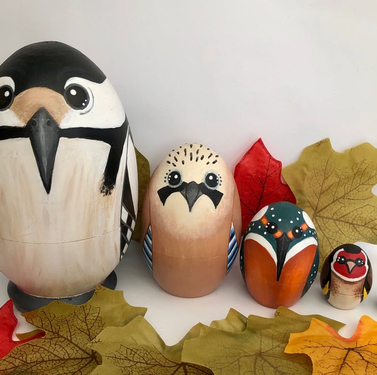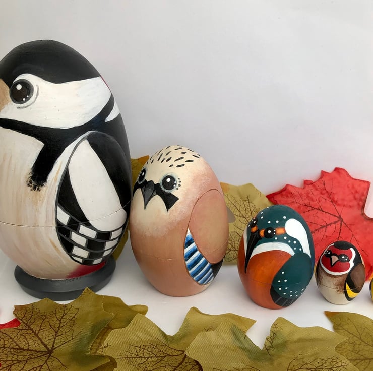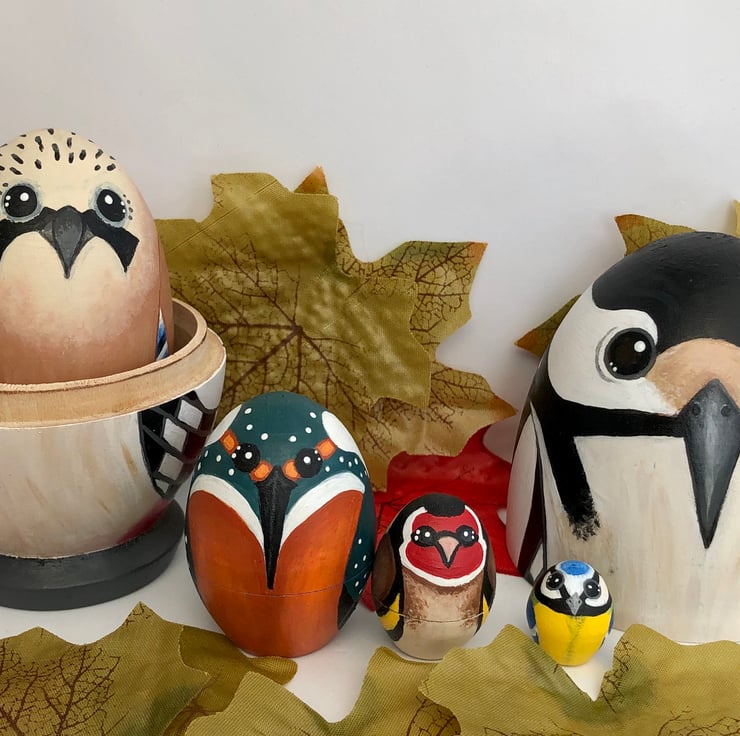 The set includes a spotted woodpecker, jay, kingfisher ,goldfinch and a tiny blue tit.