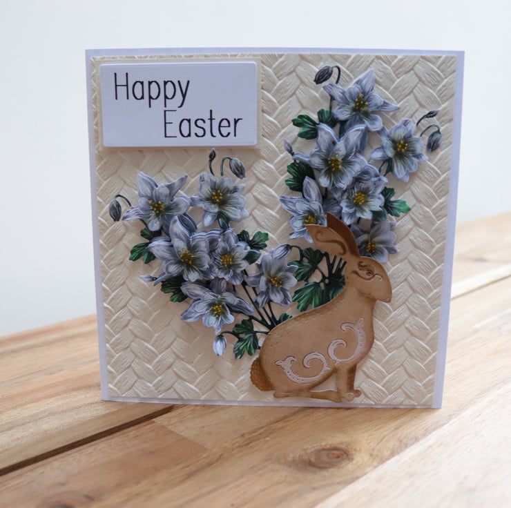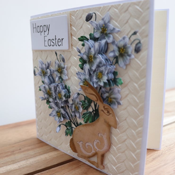 The decoupage flowers and folk art bunny sit on a embossed basket weave cream card.
