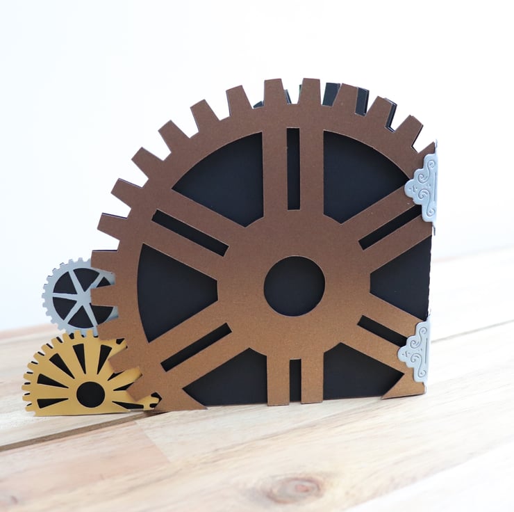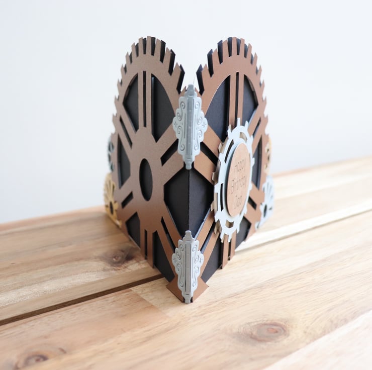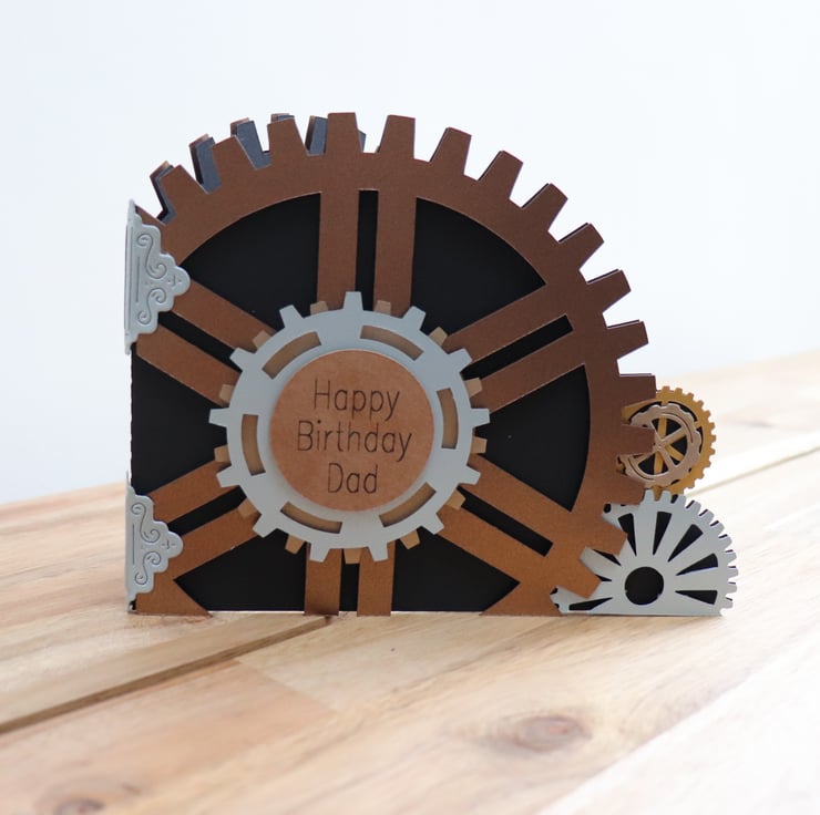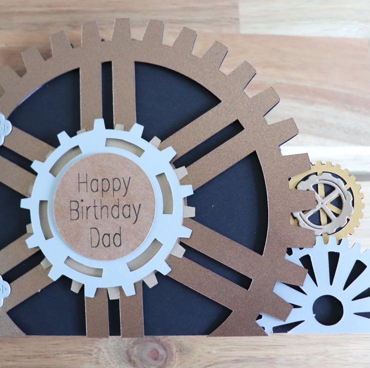 This card I have cut in the shape of cog wheels, and made 3D.