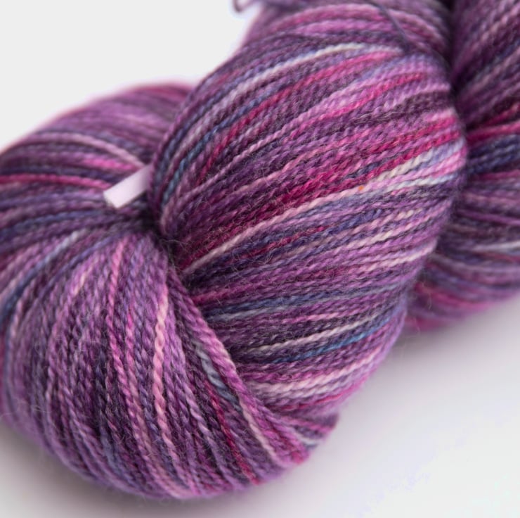 Mottled shades of purple, violet, pink, lavender and lilac with off-white (undyed). This lustrous, silky-soft, slightly fuzzy yarn with a subtle but almost shimmery sheen should make beautiful lace projects. Photographs have been taken and edited in bright but wintery natural light.