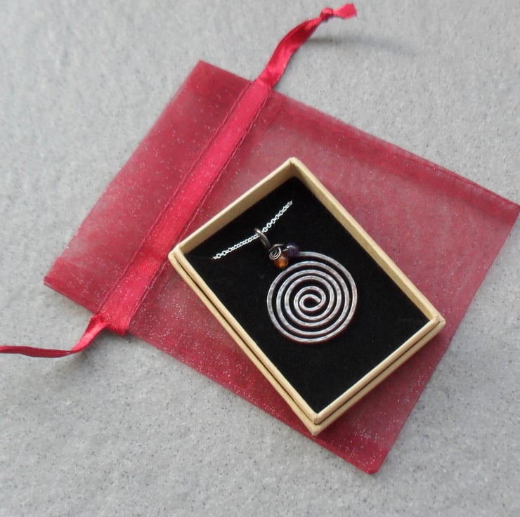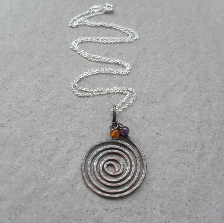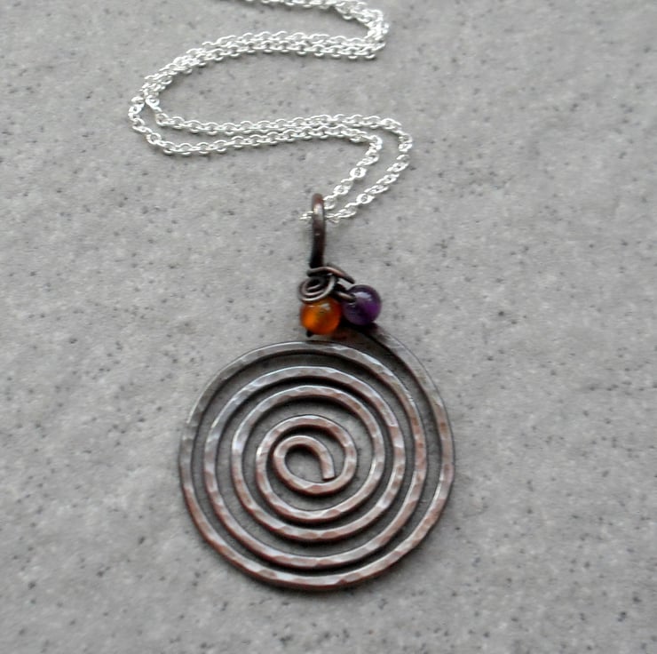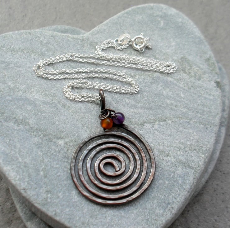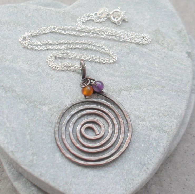 Copper spiral Pendant which has been made with copper wire has then been hammered to give texture and has been oxidised to give an aged look.the pendant has 1 carnelian and 1 small 4 mm semi precious gemstones attached at the top with copper wire