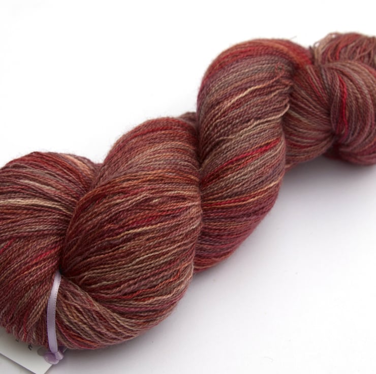 Muted tans, terracottas and mauve with some red. This lustrous, lofty, soft yarn should make beautiful lace projects, and these skeins are the superwash version of my regular Bluefaced Leicester laceweight yarn. Photographs have been taken and edited in bright but wintery natural light.