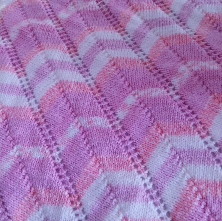 Hand-knitted baby pram blanket in a delightful blend of pinks and whites, showcasing a charming chevron pattern. Crafted with love and expertise using self-patterning Aran yarn, this blanket presents a captivating display of various pink and white hues, adding a touch of elegance to any pram or nursery.