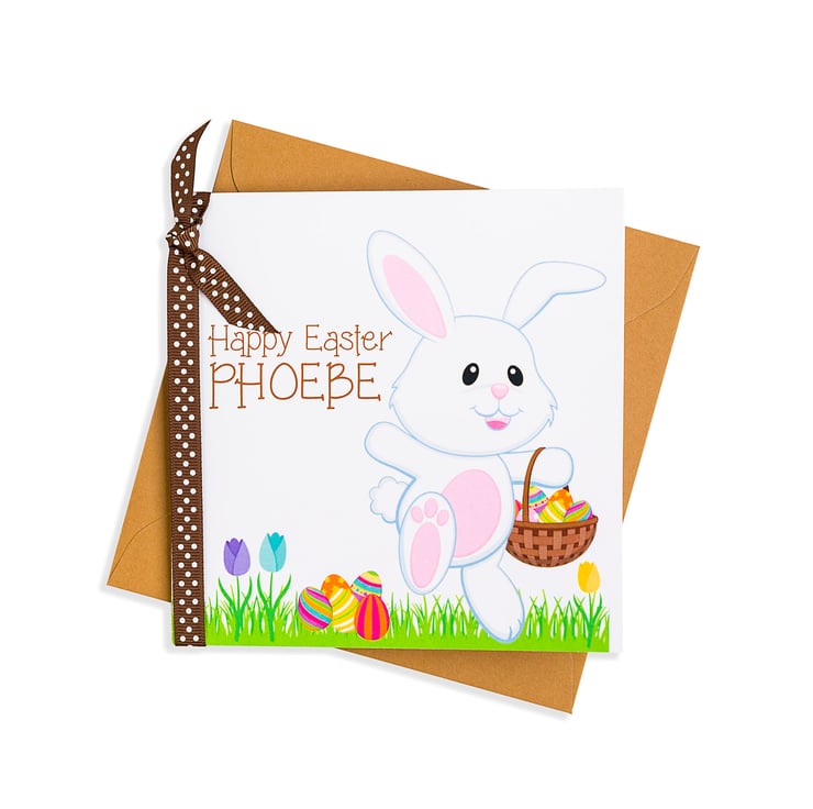 A lovely Easter Bunny celebration card personalised with your little ones name, comes with a chocolate brown envelope and embellished with a fun spotty ribbon tie to add fun finishing detail.