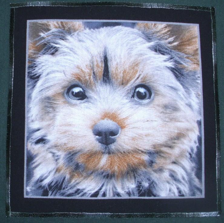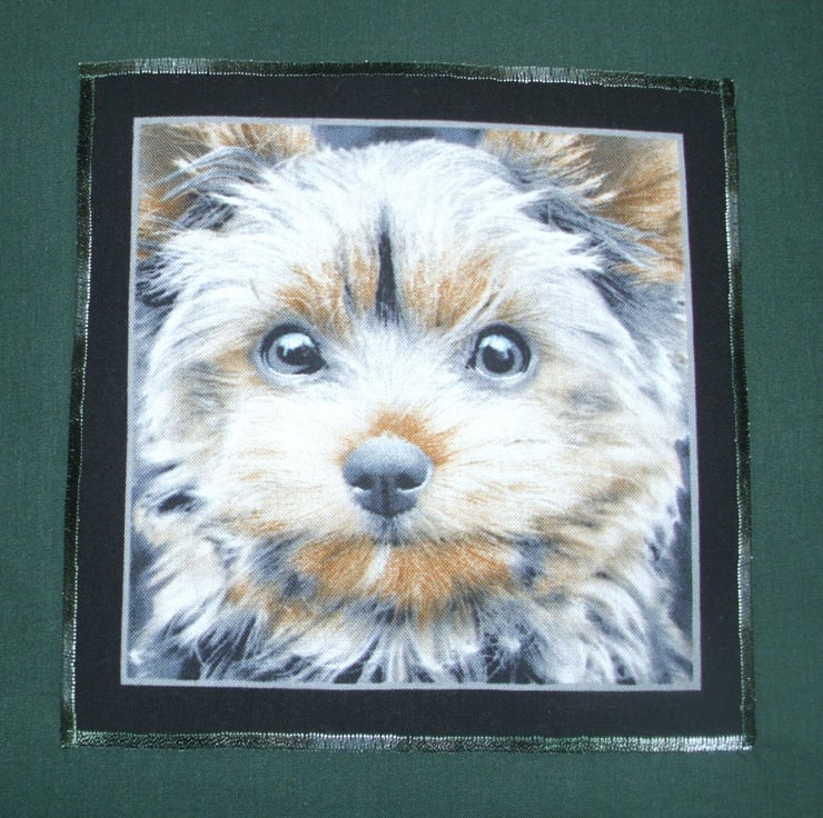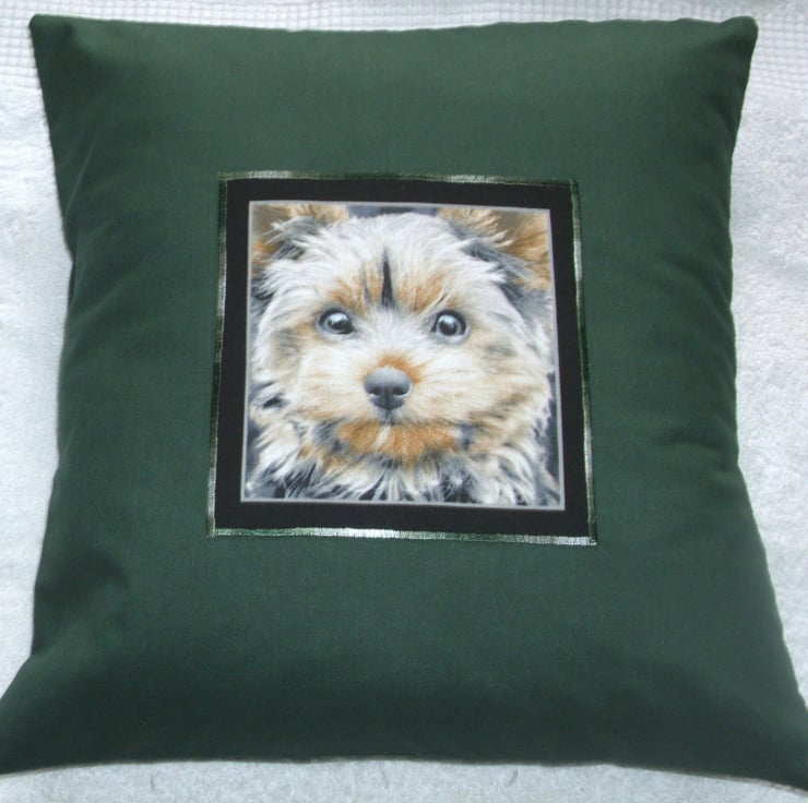 Yorkshire Terrier Puppy Portrait cushion, Adorable yorkshire terrier puppy with big soulful eyes facing front, appliqued onto a green fabric background .