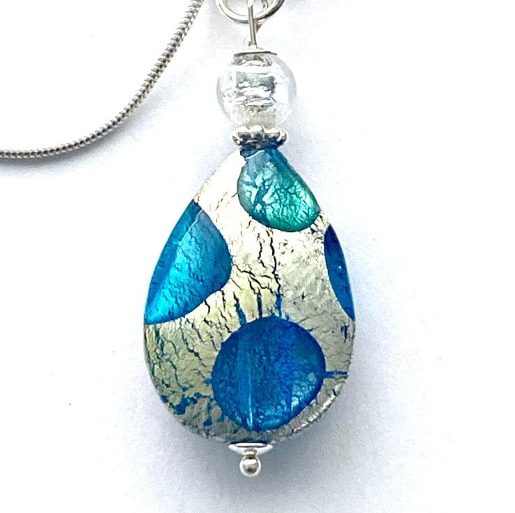 Murano glass pendant with aquamarine and silver teardrop with sterling silver.