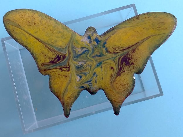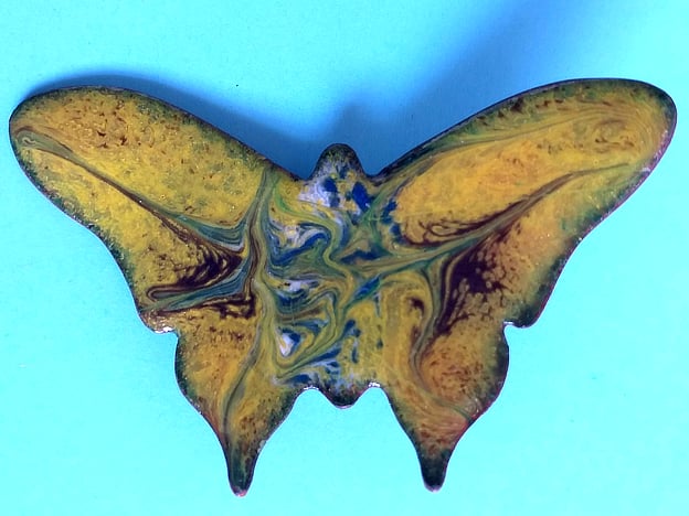 To make this brooch I first built up a base of several layers of clear enamel on the copper shape. I then added a layer of yellow enamel. After firing this, I scattered white, blue and orchid enamel powder at the centre of the piece. Then, when it was at red hot in the kiln, I drew through the surface to draw out the unique, random pattern that decorates the butterfly's wings.